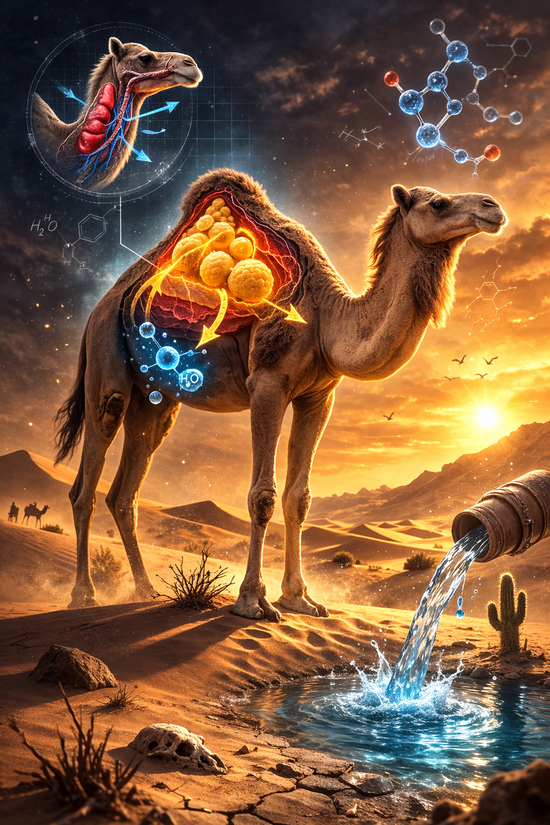 Во время расщепления жира в организме происходит химическая реакция, при которой образуются энергия, углекислый газ и вода. Именно эта вода частично помогает верблюду переживать длительные периоды без питья.