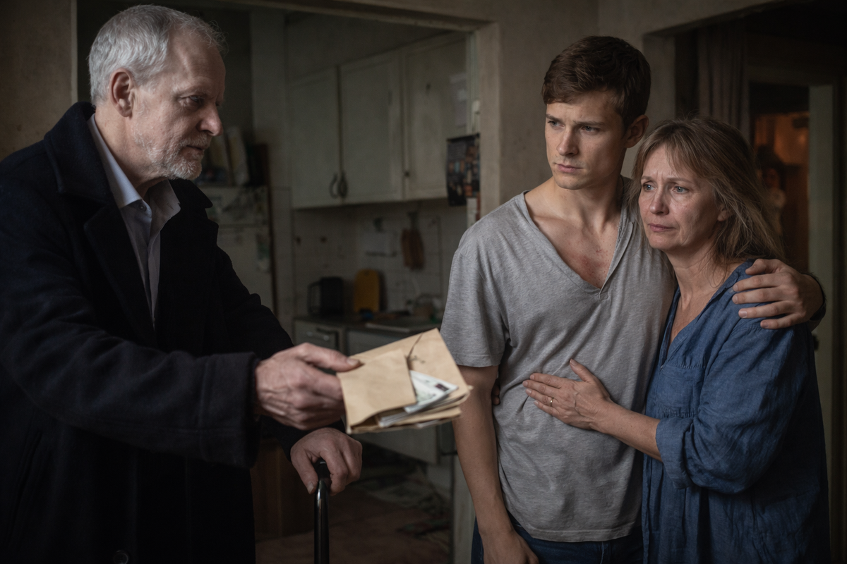 На лестничной клетке стояли двое в дорогих пальто. За ними — ещё двое, покрепче, с пустыми лицами. А между всеми этими людьми, будто в центре плохо поставленного спектакля, — сухой седой мужчина с палкой. Не старик, нет. Просто человек, которого болезнь быстро догнала и уже почти взяла за горло.