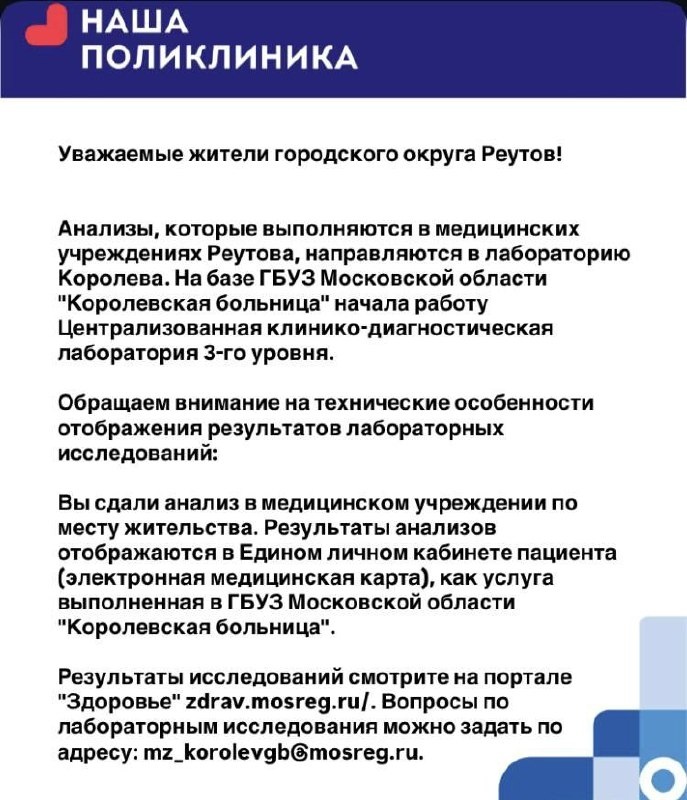 Уважаемые жители городского округа Реутов! Анализы, которые выполняются в медицинских учреждениях Реутова, направляются в лабораторию Королева. На базе ГБУЗ Московской области "Королевская больница" начала работу Централизованная клинико-диагностическая лаборатория 3-го уровня. Обращаем внимание на технические особенности отображения результатов лабораторных исследований: Вы сдали анализ в медицинском учреждении по месту жительства. Результаты анализов отображаются в Едином личном кабинете пациента (электронная медицинская карта), как услуга выполненная в ГБУЗ Московской области "Королевская больница". Результаты исследований смотрите на портале "Здоровье" zdrav.mosreg.ru/. Вопросы по лабораторным исследования можно задать по адресу: mz_korolevgb@mosreg.ru. Пресс-служба ГБУЗ Реутовская клиническая больница «Мой Реутов» ВКонтакте: https://vk.ru/my_reutov