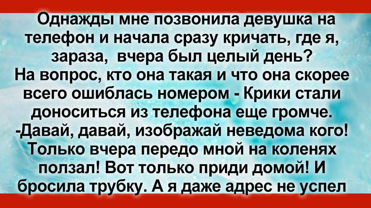 Однажды мне позвонила девушка на телефон и начала сразу кричать, где я, за раза, вчера был целый день? На вопрос, кто она такая и что она скорее всего ошиблась номером - Крики стали доноситься из телефона еще громче.