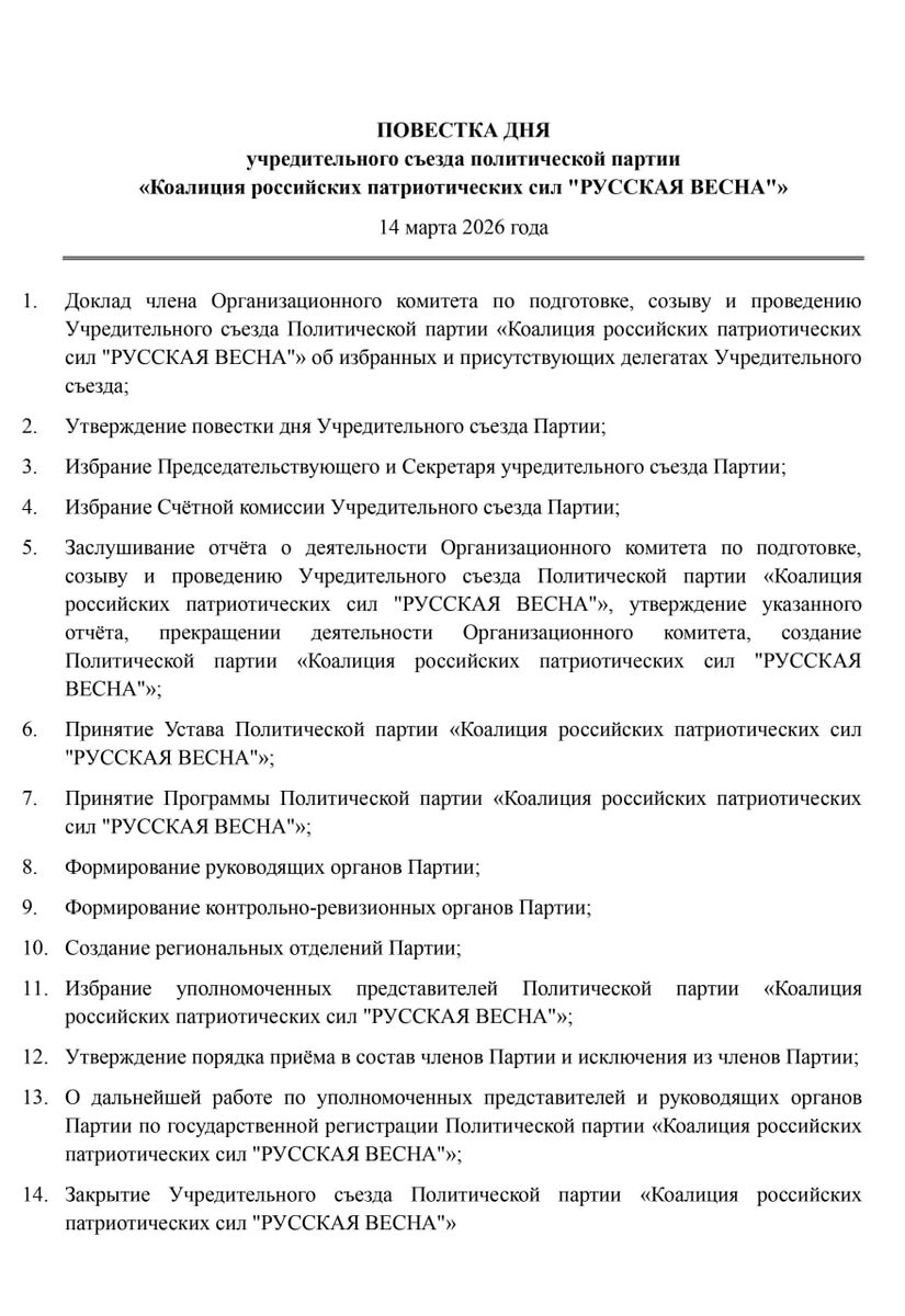 учредительного съезда политической партии «Коалиция российских патриотических сил "РУССКАЯ ВЕСНА"» 14 марта 2026 года 1. Доклад члена Организационного комитета по подготовке, созыву и проведению Учредительного съезда Политической партии «Коалиция российских патриотических сил "РУССКАЯ ВЕСНА"» об избранных и присутствующих делегатах Учредительного съезда; 2. Утверждение повестки дня Учредительного съезда Партии; 3. Избрание Председательствующего и Секретаря учредительного съезда Партии; 4. Избрание Счётной комиссии Учредительного съезда Партии; 5. Заслушивание отчёта о деятельности Организационного комитета по подготовке, созыву и проведению Учредительного съезда Политической партии «Коалиция российских патриотических сил "РУССКАЯ ВЕСНА"», утверждение указанного отчёта, прекращении деятельности Организационного комитета, создание Политической партии «Коалиция российских патриотических сил "РУССКАЯ ВЕСНА"»; 6. Принятие Устава Политической партии «Коалиция российских патриоти