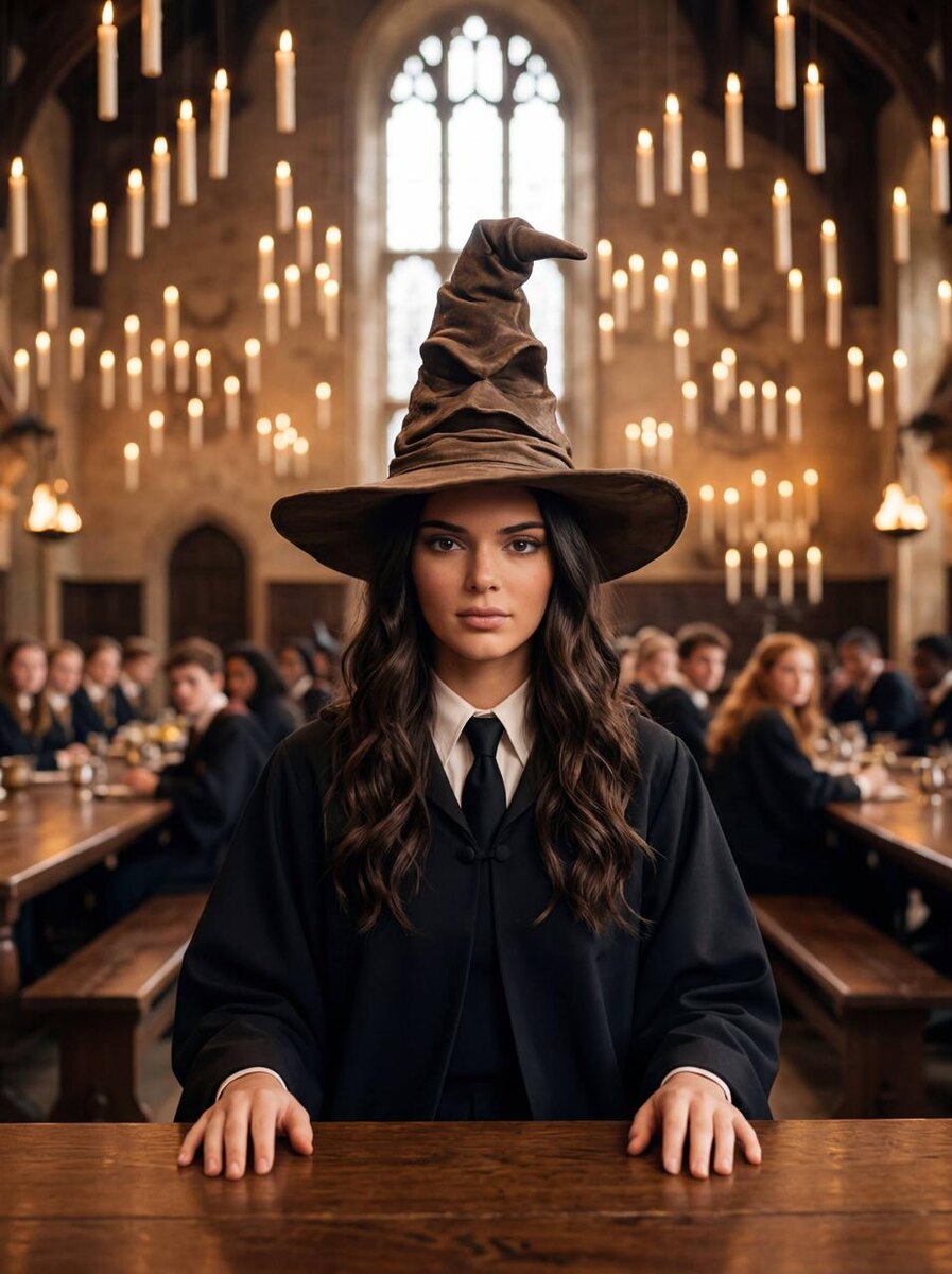 Модель: Nano Banana Сгенерировать🪄 Используйте лицо с прилагаемой фотографии девушки. Создайте ультрареалистичную сцену с Распределяющей шляпой из «Гарри Поттера» в Большом зале Хогвартса. Теплая атмосфера при свечах, мерцающий золотистый свет от парящих свечей, длинные деревянные столы, ученики, сидящие по обе стороны, высокие арочные окна, сквозь которые проникает мягкий дневной свет. Фон слегка размыт для кинематографической глубины. Девушка сидит за передним столом в Распределяющей шляпе — большой, коричневой, мятой, с текстурой старой кожи, идентичной оригиналу. Одежда: форма Хогвартса — черная мантия волшебника, белая рубашка, черный галстук. Длинные волнистые волосы, идеально уложенные, ниспадающие на плечи. Естественный мягкий макияж. Освещение: теплый волшебный свет свечей (~2700K), мягкие тени, нежное свечение на лице, теплые блики на волосах, кинематографическое рассеивание, высококачественная фэнтезийная цветокоррекция. Композиция: портрет по центру, видна верхняя часть т