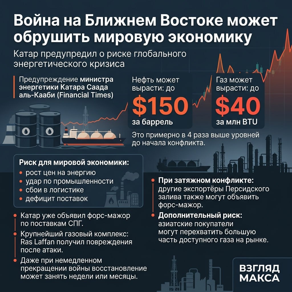 недель. С таким предупреждением выступил министр энергетики Катара Саад аль-Кааби в интервью Financial Times, заявив, что в этом случае экспортёры энергоресурсов из стран Персидского залива будут вынуждены один за другим останавливать поставки и объявлять форс-мажор. По словам аль-Кааби, развитие такого сценария приведёт к резкому скачку цен на нефть и газ. Он допустил, что стоимость нефти может взлететь до 150 долларов за баррель, а цены на газ — до 40 долларов за миллион единиц измерения, используемых на мировом газовом рынке. Это примерно в четыре раза выше уровня, который фиксировался до начала боевых действий. Министр прямо предупредил: если война продолжится, последствия почувствует весь мир. «Это приведет к обрушению экономик по всему миру», — заявил аль-Кааби. По его словам, при затяжном конфликте пострадает глобальный экономический рост, энергоресурсы подорожают для всех без исключения, а вслед за этим начнётся цепная реакция уже в промышленности и логистике. «Если война про
