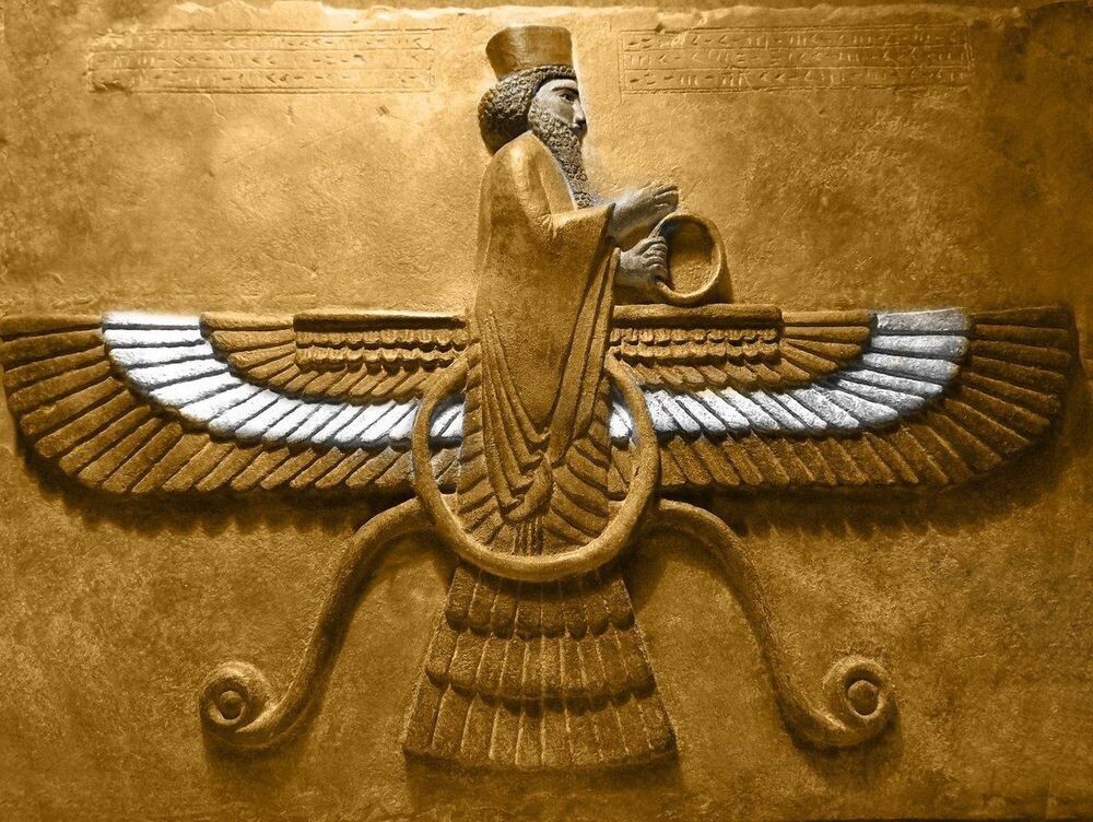 Символ зороастризма создан Дарием. В центре человек, это и Ахура Мазда и сам Дарий. В руке у него кольцо, символизирующее вечный круг жизни. Два крыла с тремя рядами перьев - триада Заратустры: добрые мысли, добрые слова, добрые дела. Три ряда перьев в хвосте это плохие мысли, плохие слова, плохие поступки, над которыми нужно подняться.