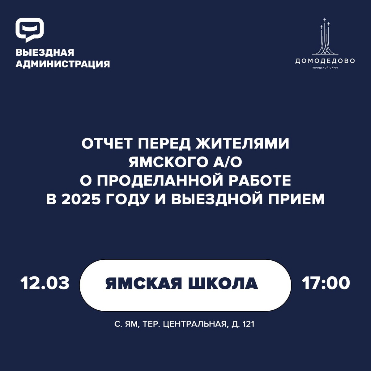 12 марта в 17:00 Ямская школа по адресу: с. Ям, тер. Центральная, д. 121 Вместе с командой расскажем об итогах 2025 года и о планах на 2026-й. Встреча будет состоять из двух частей: сначала отчёт о проделанной работе, а затем ответы на вопросы жителей в рамках выездной администрации. Для удобства отчёт будет проходить в прямом эфире. Видеотрасляция будет доступна на моей странице ВКонтакте. Трансляции прошедших отчётов: - мкр. Авиационный: https://vk.com/wall861245566_7003 - Лобановский а/о: https://vk.com/wall861245566_7092 - мкр. Центральный: https://vk.com/wall861245566_7138 - Повадинский а/о: https://vk.com/wall861245566_7227 - мкр. Белые Столбы: https://vk.com/wall861245566_7266 - Пахринский а/о: https://vk.com/wall861245566_7303 - Никитский а/о: https://vk.ru/wall861245566_7424 - мкр. Северный: https://vk.ru/wall861245566_7470 - мкр. Востряково: https://vk.com/wall861245566_7549 - Краснопутьский а/о: https://vk.ru/wall861245566_7572х - мкр. Западный: https://vk.ru/wa
