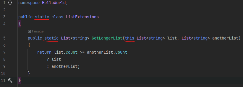 Некоторые классы в C# мы не можем изменить. Например, это классы из разных библиотек. Чтобы изменить их, нужно было бы влезть внутрь библиотеки и отредактировать её, что невозможно. Но бывает, что нам хочется добавить в такие классы новый метод. Решение проблемы есть - написать метод расширения. Метод расширения - это метод, который написан вне класса, но может применяться так же, как обычный метод - объект.Метод() Чтобы сделать метод расширения, нужно соблюсти ряд условий: Пусть даны два списка из строк. Добавим к спискам метод, позволяющий найти более длинный список. Поскольку List<...> - это класс, встроенный в C#, то мы не можем его поменять. Но мы можем сделать метод расширения: По стилю кода метод расширения помещается в классе, который называется КлассExtensions. Например, у нас это ListExtensions. Здесь на строках 7-9 мы использовали тернарный оператор условия: если длина списка list больше или равна длине anotherList, то мы выдаём в ответ list, а иначе - anotherList. Это своео