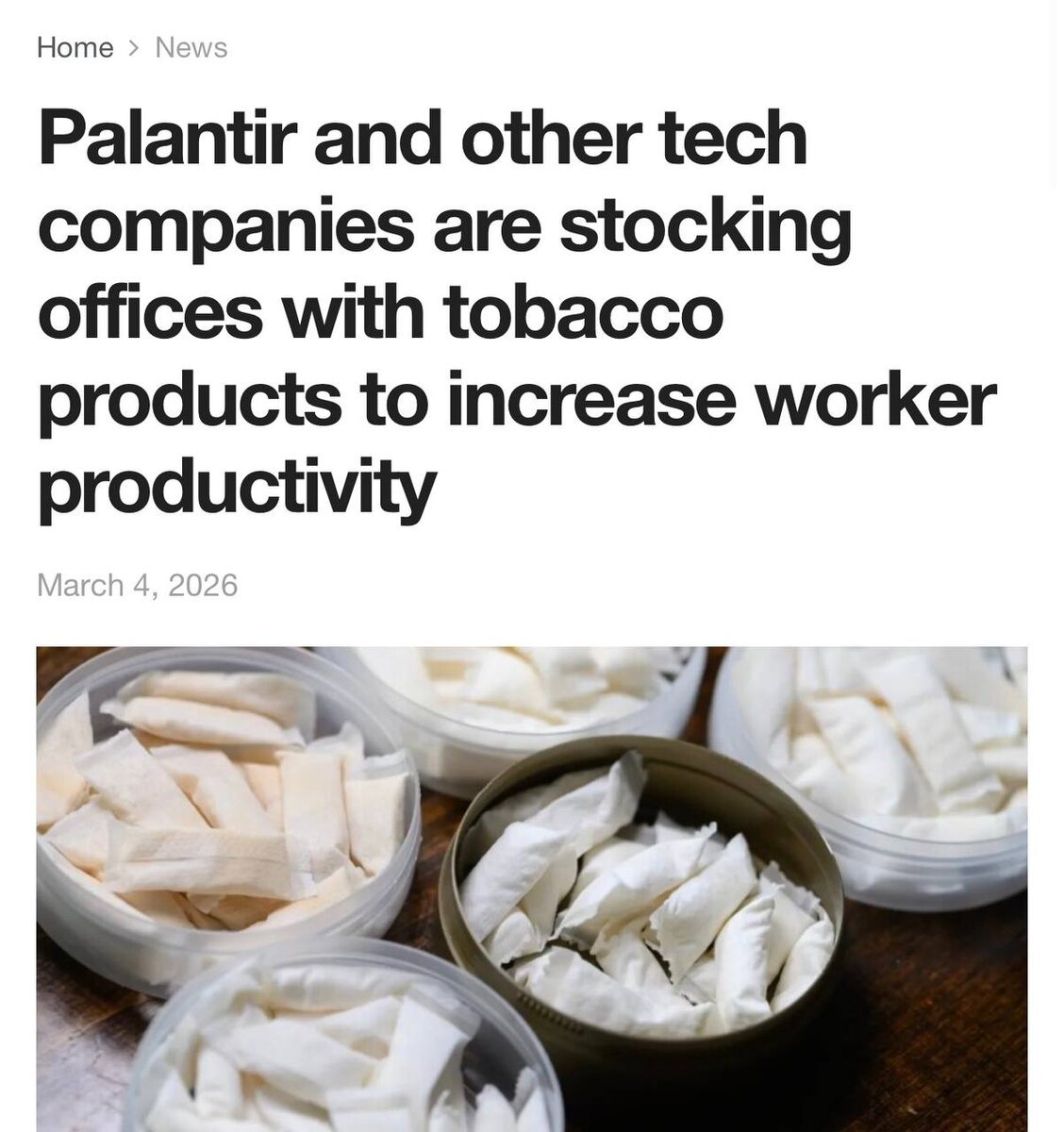 Американские директора уверяют, что никотин отлично стимулирует работяг: сотрудники реже отвлекаются на кофе и дольше сохраняют концентрацию. Любой желающий старше 21 года может просто подойти и взять порцию жевательного табака. Всё это подаётся как «легальная альтернатива» кокаину, который раньше помогал выдерживать ритм финансистам с Уолл-стрит. Подпишись на БородинLIVE Новости