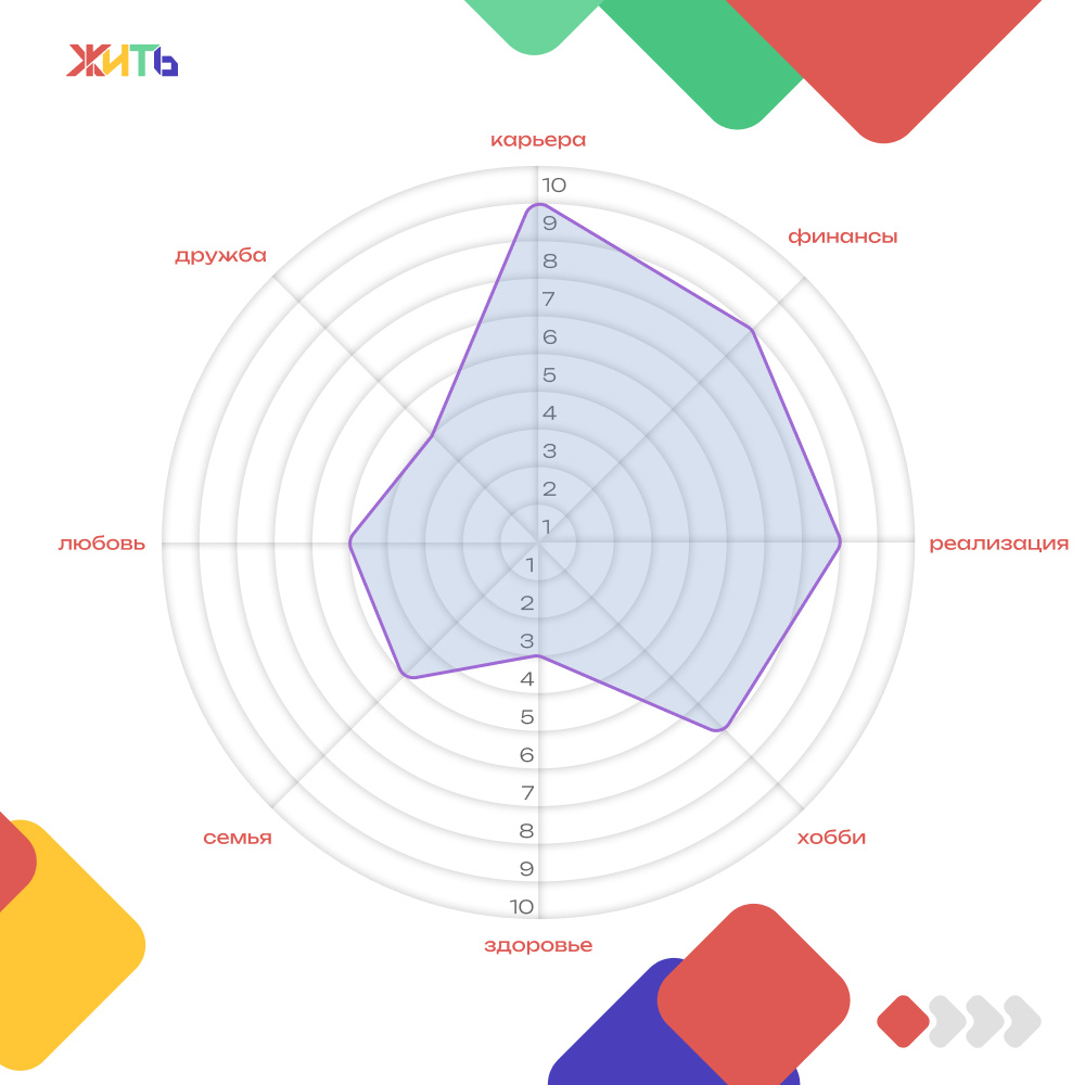 Гармония очень важна, но далеко не все из нас могут соблюдать баланс во всех сферах жизни. Из-за этого может возникать чувство неудовлетворенности, выгорание и ощущение, что время уходит впустую. Разобраться с этой проблемой поможет колесо баланса. Что это такое и как его составить? Колесо баланса — это техника, которая помогает оценить, насколько человека устраивает положение дел в разных сферах его жизни. Оно выглядит как круговая диаграмма, поделенная на сегменты, каждый из которых отведен одной из важных сфер жизни человека. Шаг 1. Определите значимые сферы своей жизни. Принято выделять 8 сфер: здоровье, семья, любовь, друзья, карьера, финансы, хобби, личностное развитие. Но вы можете придумать и свои. Чем больше сфер — тем детальнее анализ. Шаг 2. Составьте шаблон диаграммы. Нарисуйте круг и поделите его диагоналями так, чтобы получились равные треугольные части. Их должно быть ровно столько, сколько сфер вы решили взять. Дальше нанесите на диагонали десятибалльную шкалу, где 0 ба