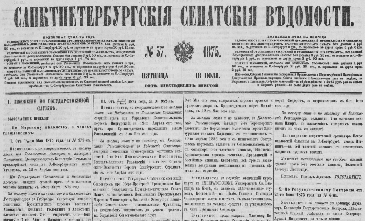 Санкт-Петербургские Сенатские ведомости. № 58, 1875 год 18 июля. Стр. 6 скан. От 15 июля 1875 года, № 92. По указу ЕГО ИМПЕРАТОРСКАГО ВЕЛПЧЕСТВА, Правительствующий Сенат слушали: представления Начальств о производстве и утверждении в чинах. Приказали: Обнародовать, чрез припечатание указа в Сенатских Ведомостях, для сведения и должного, до кого касаться будет, исполнения, что Правительствующим Сенатом: а) Произведены: 1) за выслугу лет, со старшинством: По Казанской губернии. (Ведомства Министерства Внутренних Дел.) В Титулярные Советники - Коллежские Секретари: Приставы уездов: Свияжского Константин Розенович, с 22 Июля 1873 года. https://yandex.ru/archive/catalog/a743ba63-d0b9-4c2a-bda8-0e5a21708d8a/6