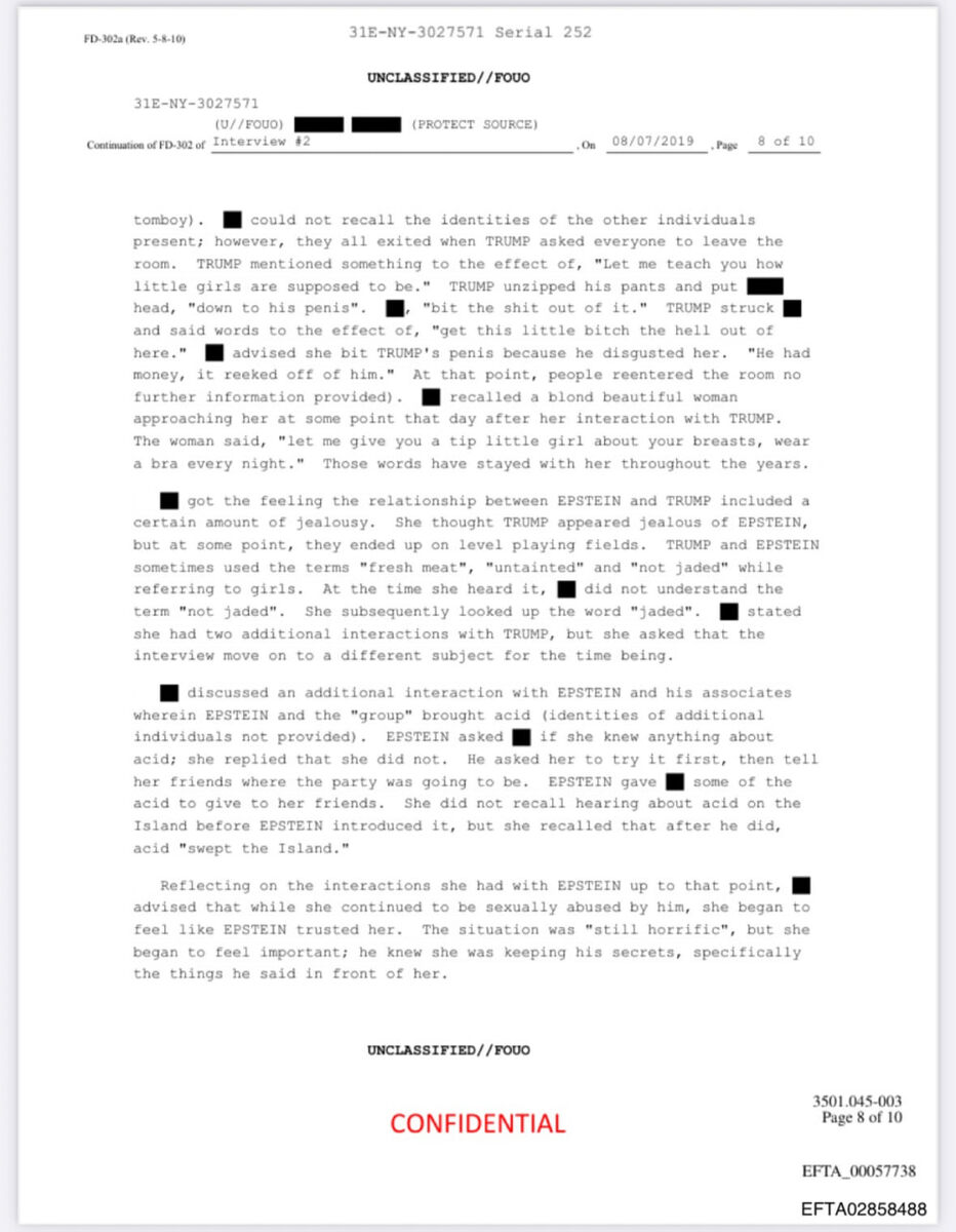 допроса ФБР, опубликованный Минюстом США Также она утверждала, что будущий президент говорил об отмывании денег через казино и о том, как он незаконно получал разрешения на строительство зданий. Скептики отмечают, что эпизод якобы относится к 1983 году (в протоколах год замазан), когда Трамп и Эпштейн еще не были знакомы. Также они напоминают, что все документы были в распоряжении министерством юстиции при администрации Байдена., и если бы в файлах Эпштейна было что-то, что они могли бы использовать, чтобы помешать Трампу снова стать президентом, они бы это нашли. Сальное Дифлопэ