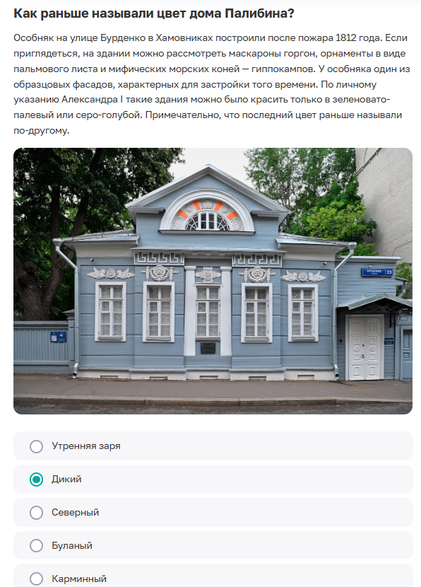 В том же формате. Вот викторина. «Активный гражданин» начисляет 40 баллов за указание правильных ответов. Баллы потом можно обменять на реальные поощрения: транспорт, музеи и другие полезные бонусы. Ниже правильные варианты, чтобы вы не гадали и точно забрали свои баллы. Пользуйтесь и проходите викторину без риска. Цвет "дикий" — это историческое название серо-голубого оттенка, утверждённого лично императором Александром I в 1816 году. Император посетил Москву после разрушительного пожара 1812 года и, чтобы бороться с пёстрой застройкой, разрешил красить дома только в два цвета: серо-голубой (дикий) и зеленовато-палевый. Деревянный особняк на Старой Басманной арендовал дядя поэта — Василий Львович Пушкин. Сейчас здесь располагается его дом-музей, воссоздающий атмосферу дворянского быта пушкинской эпохи. Домик Петра I построили в устье Северной Двины близ Архангельска в 1702 году. В 1934 году его перевезли в "Коломенское", где он стал одним из первых экспонатов музея деревянно