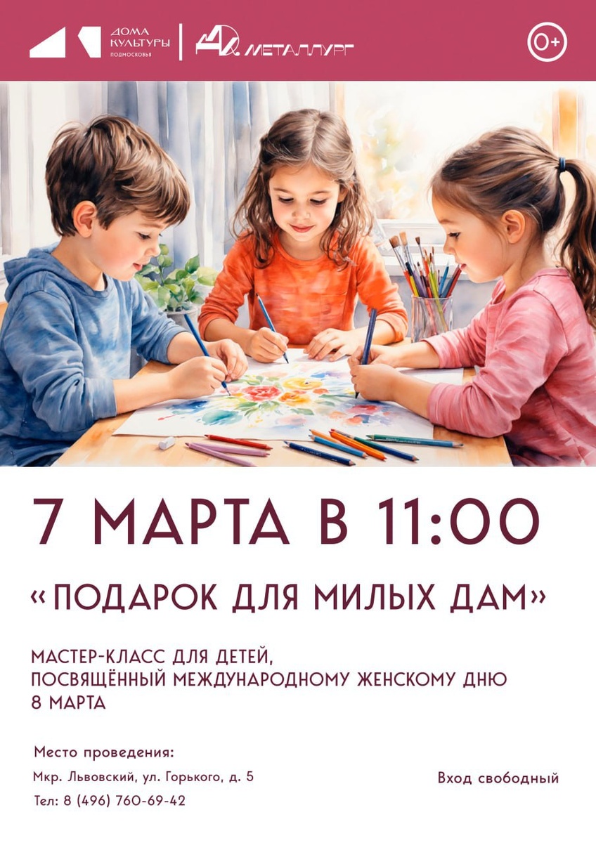 ✨ 🗓 7 марта в 11:00 🖍 Мастер-класс "Подарок для милых дам" 🗓 7 марта в 12:00 🖍 Праздничный концерт "Цветочная симфония" 🎟 Цена билета: 400 руб. Билеты в кассе ДК "Металлург", а также 👉https://qtickets.ru/event/219106 🚫 Возраст: 0+ 📆 07.03.2026 🏢 Дом культуры «Металлург» 📍 г.о. Подольск, мкр-н Львовский, ул. Горького, д. 5 💰 Вход свободный❗️ ⭐Поддержать канал голосом 🍰Где поесть в Подольске ✅ Мероприятия Подольск https://dzen.ru/id/66ed500f7b5671493eca3fd6 https://vk.ru/podolsk_events http://dzen.ru/podolsk_events