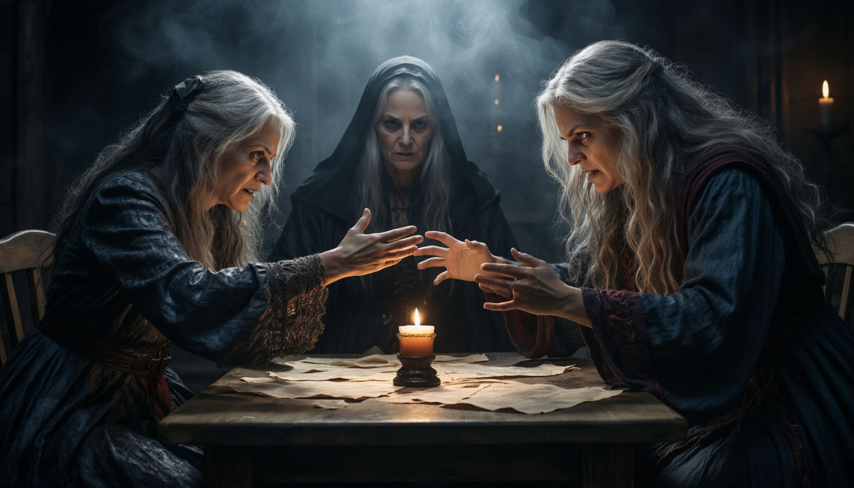 Из тени выходят ещё две. Уже старухи. Сгорбленные, пальцы скрючены, ногти — чёрные, длинные, как когти.