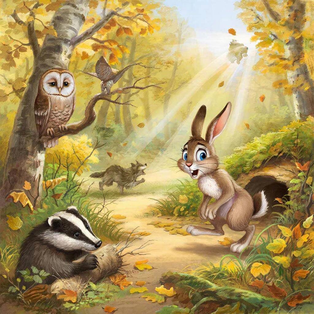 Давным-давно жил да был в одной небольшой лесной деревеньке Заяц. И звали его Шорох. Был он молодым и очень беспокойным: только и знал, что прислушиваться не треснет ли где ветка, не хрустнет ли снег, не крадется ли кто. И - это, конечно, странно - но беда всегда его находила. Как только слух доходил, что где-то кто-то видел Лису, Шорох тут же бежал зарываться в самую глубокую нору, забывая припасы на поверхности. Приходил Медведь — и плакали все его припасы. Как только ветер доносил запах далекого костра — Шорох вскакивал и мчался к реке, чтобы пересидеть на островке, промокая до нитки и простужая горло. Костер тушил дождь, а насморк у Шороха оставался на неделю. Соседи его, старый Барсук и тетушка Сова, только вздыхали: — Эх, Шорох-Шорох, ну куда ты бежишь? Посиди с нами, пирог вот тепленький еще с репой поешь. — Как же можно сидеть?! — волновался Заяц. — Вон за бугром, говорят, охотника с собакой видели! Надо прятаться! — А ты не беги навстречу-то, — зевала Сова. — Охотник, может, и
