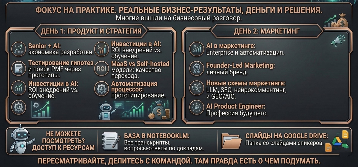 ). Слово "прототип" встречается часто, но ребята очень старались передать не столько суть техническую, а именно практику применения. И у многих получилось выйти на бизнесовый разговор. Про деньги, решения, реальные результаты. ✨ Доклады первого дня (про продукт и стратегию): 1. Максим Ключников "Senior + AI вместо целой команды: экономика разработки в 2026" 2. Миша Карпов "100 прототипов за год: тестирование гипотез и поиск PMF" 3. Влад Корнышев "Инвестиции в AI: внедрение решений VS обучение команды" 4. Рефат Аметов "Как измерять ROI AI-внедрений и не попасть в "пилотный ад" 5. Сергей Нотевский "MaaS vs Self-hosted: переход на свои модели без провала качества" 6. Константин Доронин "Прототипирование автоматизации процессов" ✨ Доклады второго дня (про маркетинг): 1. Валера Ковальский "Внедрение AI в Enterprise: сколько стоят локальные модели" 2. Саша Поляков "Создание AI-скиллов для автоматизации маркетинга (Воркшоп)" 3. Ислам Мидов "Founder-Led Marketing. Как продавать IT-продук