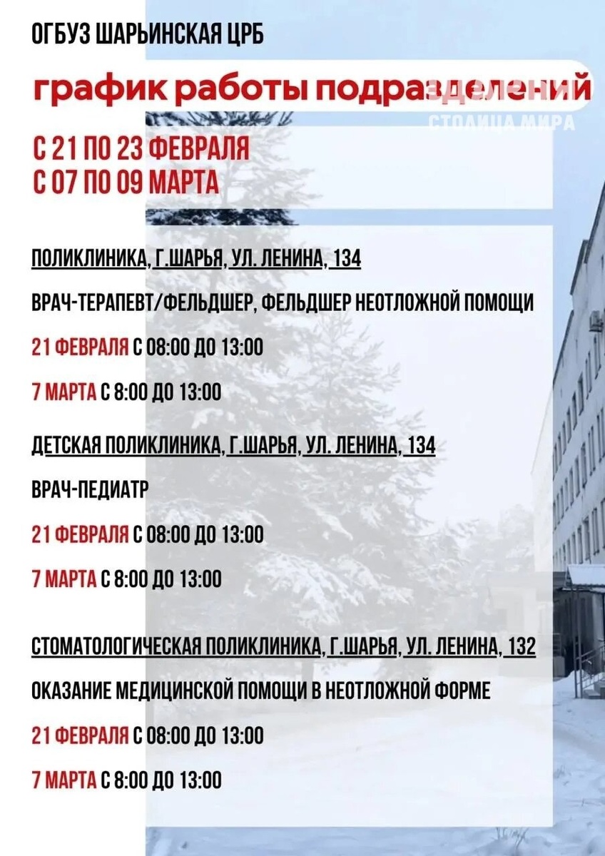 График работы специалистов Шарьинской ЦРБ в праздничные дни