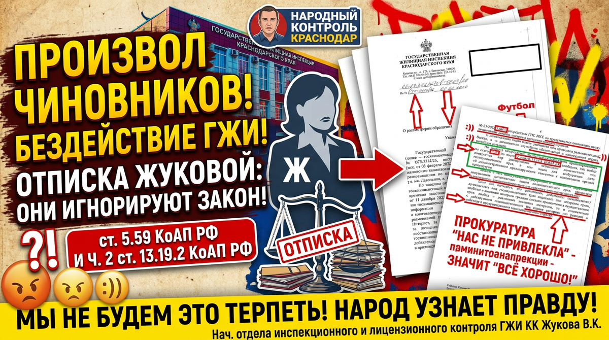 Жалоба на бездействие начальника отдела инспекционного и лицензионного контроля Государственной жилищной инспекции Краснодарского края Жуковой В.К., формальный ответ от 06.03.2026 № 75-О-5603/26, игнорирование длящихся нарушений, неисполнение обязанности по привлечению виновных к ответственности, а также наличие в действиях (бездействии) должностных лиц ГЖИ края признаков составов административных правонарушений, предусмотренных статьей 5.59 КоАП РФ и частью 2 статьи 13.19.2 КоАП РФ
