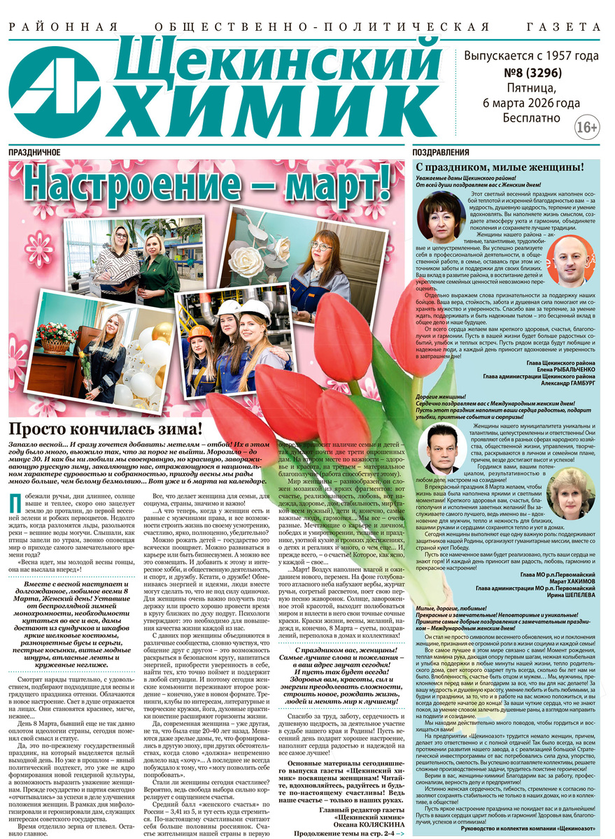 Пятница в преддверии 8 Марта - прекрасный день, а с газетой «Щекинский химик» он станет еще приятнее!