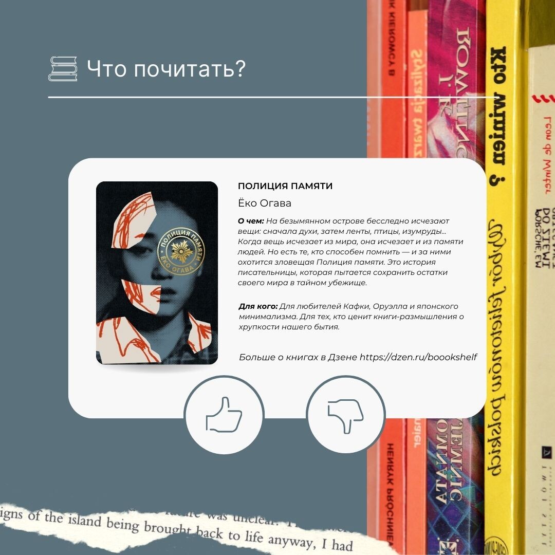 Представьте мир, где вещи исчезают навсегда. Сегодня это ленточки для волос, завтра — колокольчики, послезавтра — птицы или духи. Но исчезновение — это только полбеды. Вместе с предметом из памяти людей стирается само воспоминание о нем. Вы смотрите на птицу и не понимаете, что это за странное существо, зачем оно здесь и как оно называлось. Роман японской писательницы Ёко Огавы «Полиция памяти», написанный еще в 1994 году, сегодня стал мировым бестселлером и вошел в шорт-лист Букеровской премии. И это самая необычная антиутопия, которую вы когда-либо читали. Действие происходит на безымянном острове, где за порядком следит жуткая и безмолвная «Полиция памяти». Их задача — следить за тем, чтобы люди не хранили запрещенные (исчезнувшие) вещи. Если роза исчезла, ты должен оборвать лепестки и бросить их в реку. Если ты продолжаешь помнить — ты преступник. Главная героиня, молодая писательница, наблюдает, как ее мир становится всё более пустым и серым. Но есть те, чья память не подвластна