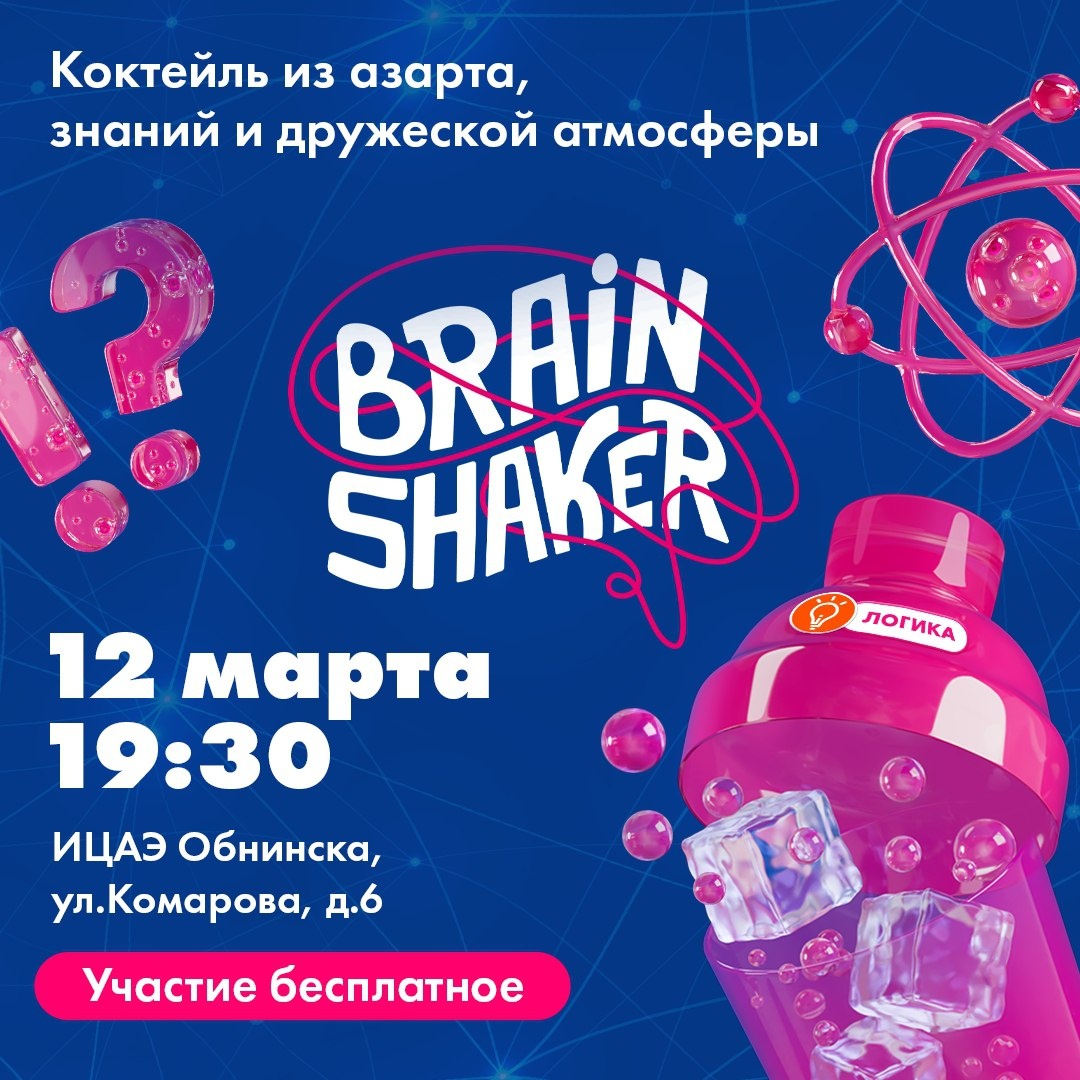 ! 🧠 Вторая игра интеллектуального турнира BrainShaker состоится 12 марта. В этот раз квиз не будет посвящен узкой теме, поэтому не настаиваем на тематических костюмах. Но не забудьте хорошее настроение, оно точно пригодится! Как принять участие: - собрать команду от 3 до 6 человек; - зарегистрироваться: https://myatom.ru/brainshaker-registration/ 🏆 Напоминаем, что команды, которые примут участие минимум в трёх играх и в своих городах станут лидерами по количеству набранных баллов, смогут посоревноваться в финале BrainShaker. 📍 Где: ИЦАЭ Обнинска (ул. Комарова, д. 6, 1 этаж) ⏰ Когда: 12 марта, 19:30 👍 Подписаться | Ваша реклама