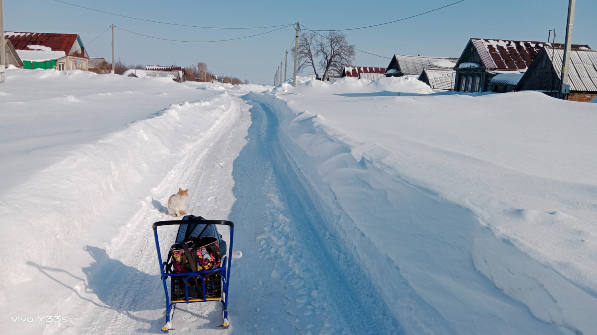 Вот такие они.Кроме снега снимать нечего.Но надеюсь скоро они растаят.У нас все как обычно.Зиму прожили и хорошо.Была она холодная и снежная.Сегодня ходила в автолавка,с санками.Кот Рыжик меня встречал.Немного закупаюсь