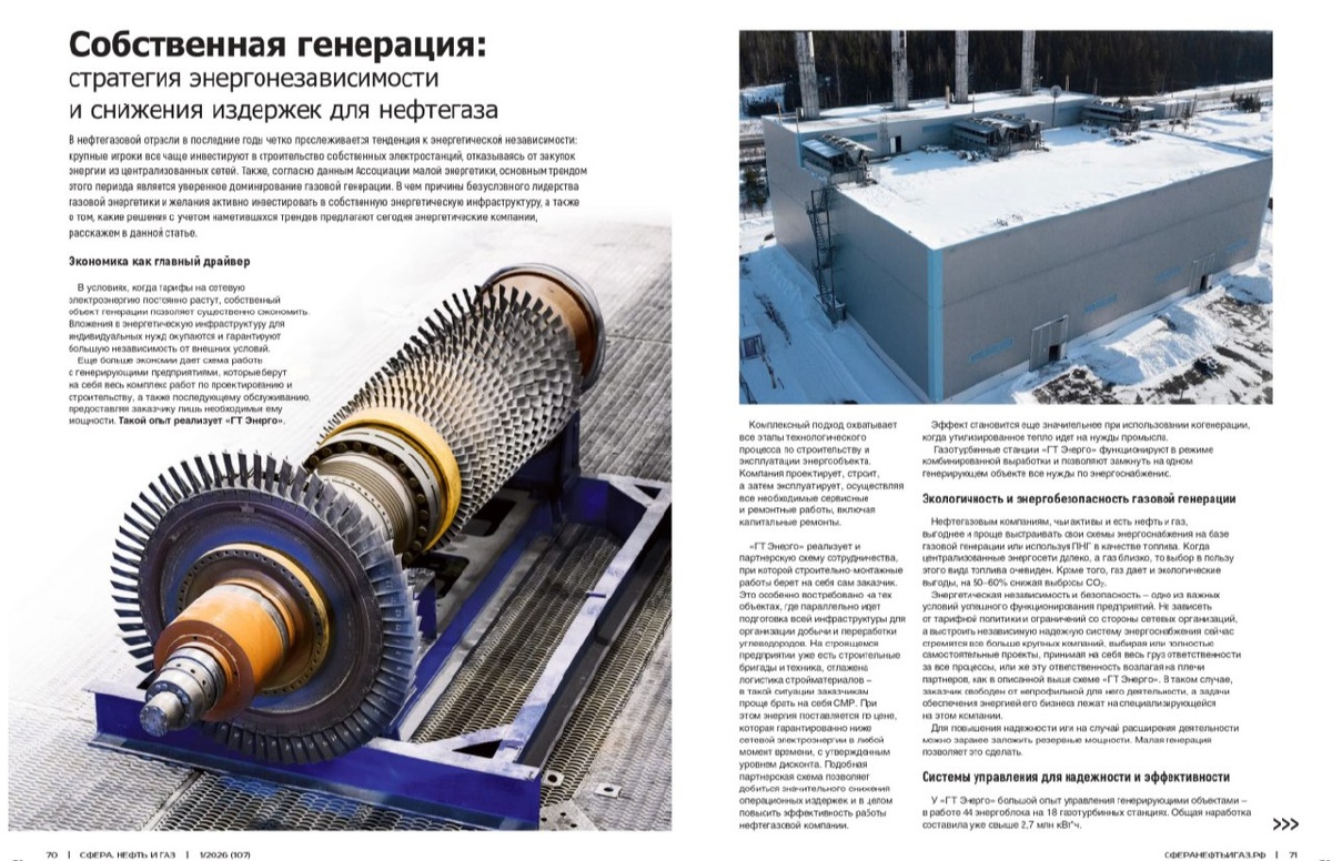 ? Преобладание газовой генерации и переход крупных компаний на собственное энергоснабжение – в числе трендов энергетики. Об одном из актуальных решений –газотурбинных станциях «ГТ Энерго» – рассказали в первом за 2026 год выпуске журнала СФЕРА НЕФТЬ И ГАЗ. Почему распределённая, малая генерация превращается в стратегический тренд, поясняем на примере наших ГТ ТЭЦ. 🔸Это экономически обосновано. Энергия поставляется по цене, которая гарантированно ниже сетевой электроэнергии в любой момент времени с утверждённым уровнем дисконта. 🔸Более экологично. Использование газа в качестве топлива на 50-60% снижает выбросы СО2. 🔸Энергобезопасность. Собственная генерация позволяет не зависеть от тарифной политики и ограничений со стороны сетевых организаций. Можно заранее предусмотреть резерв мощности. Подробнее – в журнале. #ГТЭнергоПишет #ГТЭнергоЭксперт