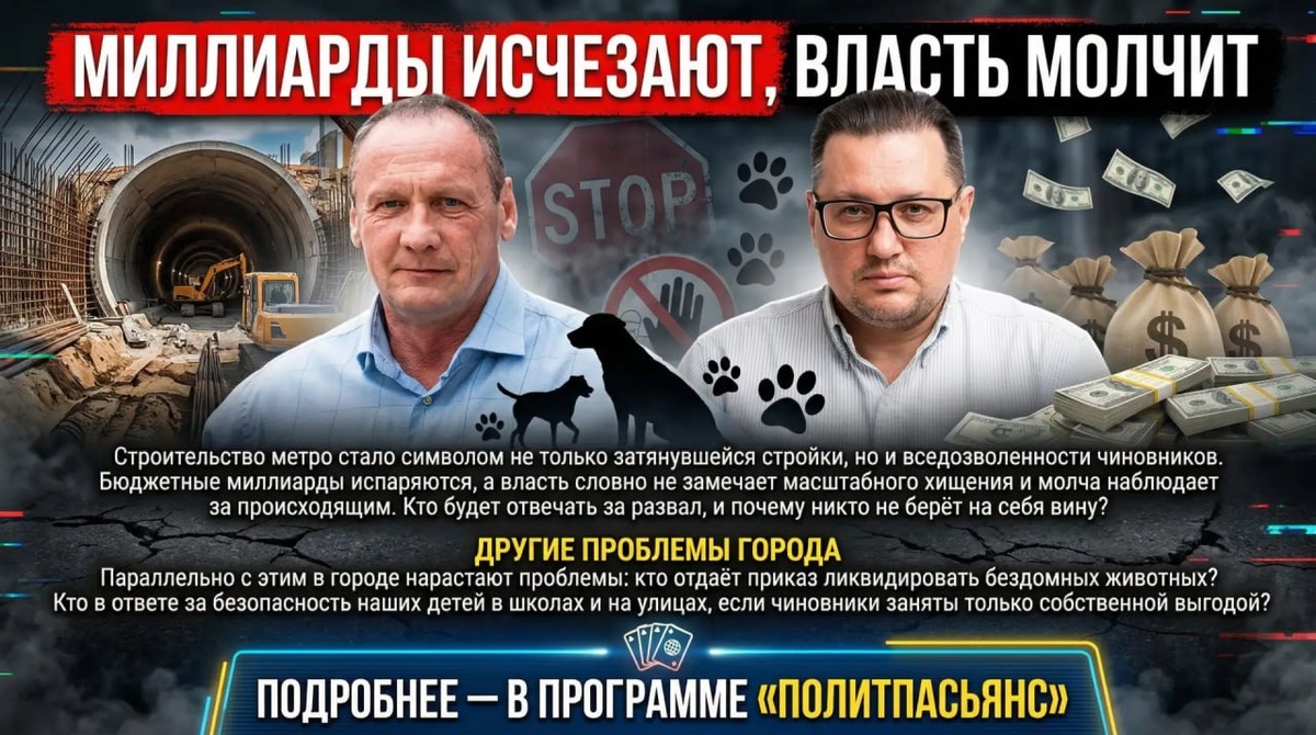 Строительство метро стало символом не только затянувшейся стройки, но и вседозволенности чиновников. Бюджетные миллиарды испаряются, а власть словно не замечает масштабного хищения и молча наблюдает за происходящим. Кто будет отвечать за развал, и почему никто не берёт на себя вину? Параллельно с этим в городе нарастают проблемы: кто отдаёт приказ ликвидировать бездомных животных? Кто в ответе за безопасность наших детей в школах и на улицах, если чиновники заняты только собственной выгодой? Подробнее — в программе «Политпасьянс» в МАХ-канале Афонтово Подписаться на МАХ-канал Афонтово