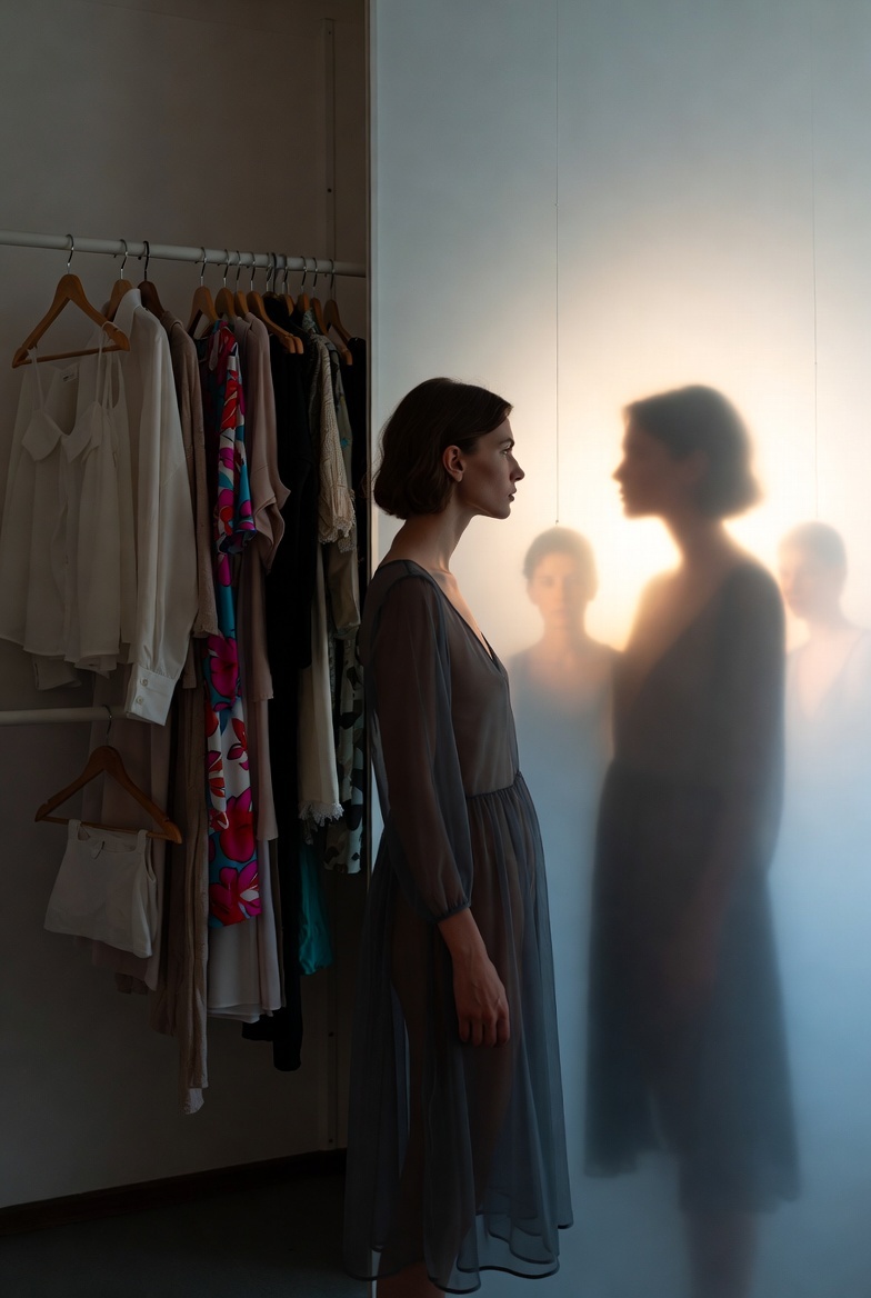 Однажды утром она открыла шкаф и не увидела ничего. Вернее, вещи были: на плечиках, в стопках, всё на своих местах, но в них будто погас свет. Строгие блузки казались чужими, как будто их принесли по ошибке из другого дома. Яркие платья выглядели как костюмы для вечеринки, на которую она не хотела идти. Скромные вещи справа просто молчали, как будто стеснялись себя. Алина стояла в нижнем белье перед пустым, но набитым шкафом, и впервые не знала, кем ей сегодня быть.