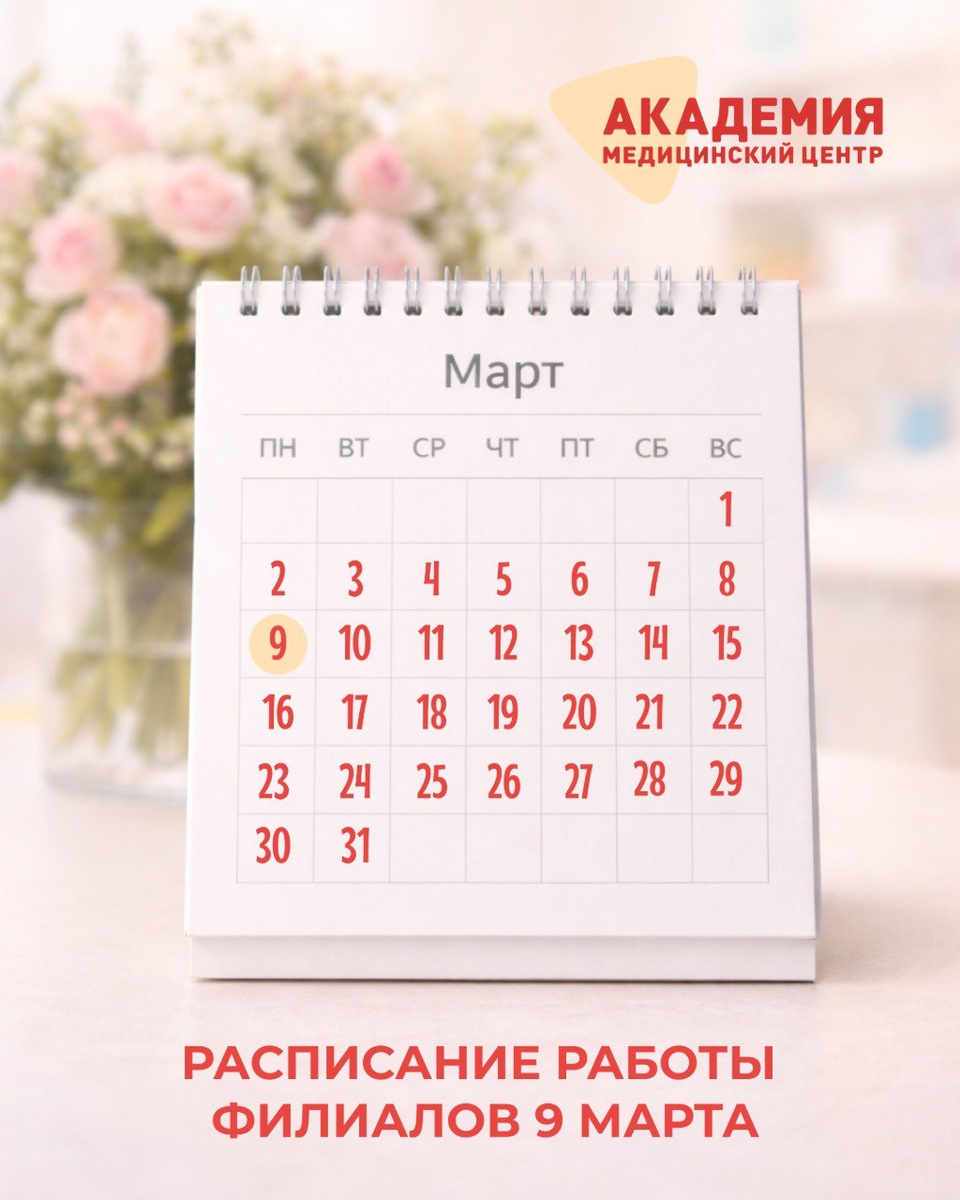 Уважаемые пациенты! Сообщаем режим работы структурных подразделений медицинского центра 9 марта. Пожалуйста, учитывайте время работы при планировании визита. 📍 Стасова, 18 🕗 09.03.2026 — с 08:00 до 15:00 📍 Красноармейская, 2 🕗 09.03.2026 — с 08:00 до 15:00 📍 Ульяновский, 11 🕗 09.03.2026 — с 08:00 до 15:00 📍 Академия МРТ, ул. III Интернационала, 7 🕗 09.03.2026 — с 08:00 до 15:00 📞 Колл-центр 🕗 09.03.2026 — с 08:00 до 15:00 Берегите себя и будьте здоровы ❤️ Запись в клинику через👇 — телефон 📞 +7 8422 27-05-05 — сайт 🌐 academy-med.ru — телеграм 🌐 @Academychat73 💠 НАШ КАНАЛ В MAX
