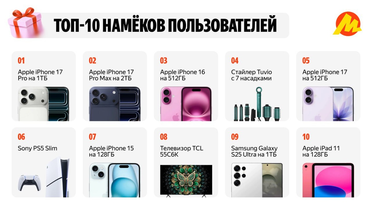 В топ «намеков» вошли iPhone 17, фен-стайлер Tuvio, фены Bork, маски для ухода за лицом FOREO, телефоны Apple и Samsung, а также, внимание, (!) PlayStation 5. Также за помощью для выбора подарка россияне начали чаще обращаться к ИИ — перед 8 марта юзеры обратились к ИИ-агенту Маркета более 27 тысяч раз. Парни, действуйте.