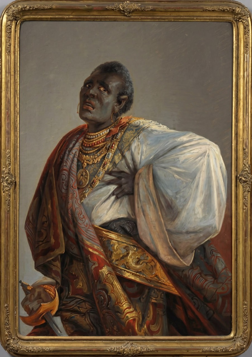 Когда Олдридж впервые прибыл в Россию на гастроли, он уже имел большой опыт исполнения главных ролей в пьесах Шекспира. На петербургской сцене Олдридж представал в ролях Отелло, Шейлока, короля Лира. Для своего времени это был редкий случай — Отелло играл темнокожий артист без грима. Современники вспоминали его сценическую манеру контрастной. На сцене он держал себя скромно и с достоинством, но в кульминациях играл неистово. #НаполотнахБТМ Айра Олдридж изображен на нейтральном бежевом фоне в театральном костюме. На шее и груди — ожерелья, толстые золотые жгуты и массивные цепи. В ушах крупные серьги-кольца с маленькими белыми камнями. В образе одновременно читаются власть и уязвимость Отелло.