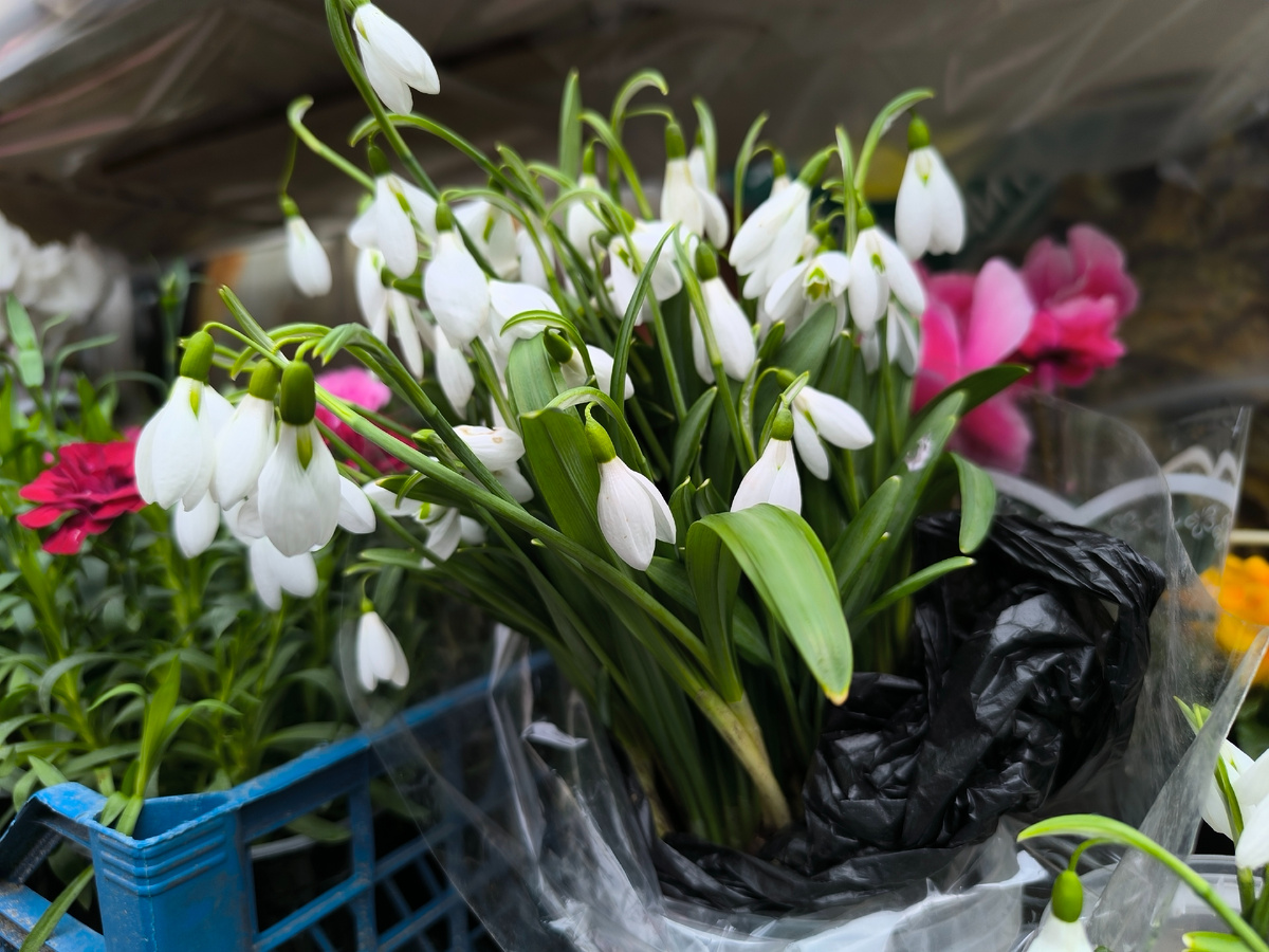 На рынке множество продавцов торгуют цветами. Тюльпанчик 150 рублей. В городских цветочных магазинах 160 рублей.