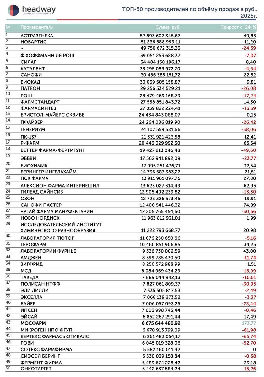🏭 Топ-50 формирует долю (в руб.) 77,33% от всех производителей, участвующих в госзакупках, с объёмом - 872,20 млрд руб. 🏆Топ-3 по объёму продаж в млрд руб. 1. АстраЗенека - 52,89 2. Новартис - 51,23 3. Ф.Хоффман Ля Рош - 39,05 (Из рейтинга исключён неизвестный производитель) АстраЗенека в 2025г. возглавляет рейтинг, однако в 2024г. занимала седьмую строчку рейтинга с объёмом продаж 35,30 млрд руб. Главный бестселлер у АстраЗенеки - Форсига, объём закупок которого составляет 25,15 млрд руб. в 2025г., на втором месте Тагриссо - 8,42 млрд руб, на третьем - Имфинзи 7,08 млрд руб. 📈 Победители по приросту в топ-50,% 🥇Мосфарм 🔥 +173,8% (рост в 2,7 раза). Продажи натрия хлорида в 2025г. составили 5,35 млрд руб. против 1,55 млрд руб. в 2024г. 🥈Санофи Пастер +74,9% 🥉Берингер Ингельхайм +71,5% 🏅Р-Фарм +65,5% 🏅Алексион Фарма Интернешнл +62,9% 🏅АстраЗенека +49,9% (+17,6 млрд руб.) 📉 Самые сильные падения в топ-50, % 1. Вертекс Фармасьютикалс −65,7% 2. Микроген −62,0% 3. Р