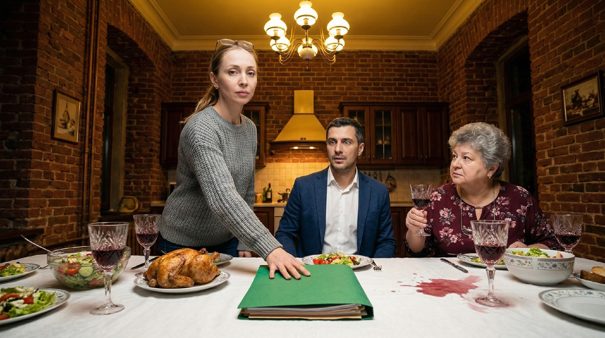Тамара Сергеевна медленно поставила бокал на стол. Рука у неё дрогнула, и вино плеснулось на скатерть бордовым пятном. Она посмотрела на сына. Потом на меня.