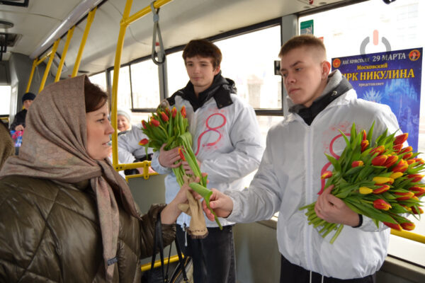 Волонтеры городского Дома молодежи помогли создать в городе неповторимую атмосферу первого весеннего праздника. В преддверии 8 Марта молодые люди подготовили сюрприз для пассажирок автобуса №1. Идею всесторонне поддержала администрация Тамбова. «Наша специальная добровольческая акция «Весенний экспресс» проходит уже четвертый год, причем только в Тамбове. В других регионах такого опыта нет. В то же время это одно из направлений Всероссийской акции «Вам, любимые», в рамках которой волонтеры поздравляют милых дам в общественных местах», – пояснила руководитель Центра общественного развития «Добро.Центр» Алина Трушкина. Праздник стал поводом еще раз выразить любовь и признательность женщинам – хранительницам домашнего очага, труженицам и музам. Приятную миссию взяли на себя четыре добровольца. У двоих в руках были охапки тюльпанов. «Поздравить дам с праздником – это прекрасный добрый жест. Поучаствовать в таком деле – здорово! Поэтому я решил присоединиться к ребятам», – признался Арсени