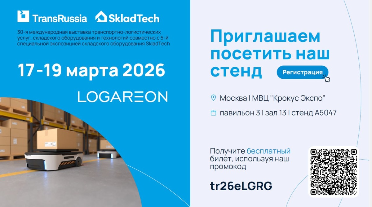 ! Будем рады увидеть вас в числе посетителей нашего стенда на международной выставке транспортно-логистических услуг, складского оборудования и технологий TransRussia 2025. Мероприятие пройдет с 17 по 19 марта 2026 года в выставочном центре «Крокус Экспо» в Москве. Ищите нас: павильон 3, зал 13, стенд №A5047 Зарегистрируйтесь на TransRussia 2026 по нашей ссылке, чтобы получить бесплатный билет. Ваш промокод: tr26eLGRG