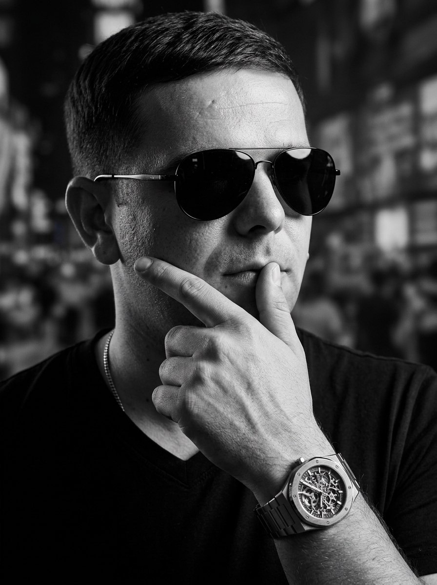 🤖Генерировать можно здесь: 👉БОТ ДЛЯ ГЕНЕРАЦИИ Режим Nano Banana 2/Pro ИНСТРУКЦИЯ Черно-белый портрет привлекательного молодого мужчины с загруженного фото. Черты лица, форма глаз, цвет волос и общий облик мужчины строго перенесены с загруженного референсного фото - точное сходство обязательно. В стильных авиаторах с темными линзами. Он одет в черную футболку с V-образным вырезом, на шее — тонкая цепочка, на запястье — роскошные часы с видимым скелетонизированным циферблатом и металлическим браслетом. Мужчина задумчиво прикасается указательным пальцем к губам, взгляд направлен в сторону — выражение лица сосредоточенное, немного загадочное, с оттенком уверенности. Фон размыт, создавая эффект боке — возможно, уличная или городская среда, но без деталей, чтобы не отвлекать внимание от модели. Освещение драматичное, контрастное: яркий свет падает со стороны, подчеркивая скулы, переносицу и текстуру кожи, а противоположная сторона лица находится в мягкой тени. Съемка выполнена крупным пла