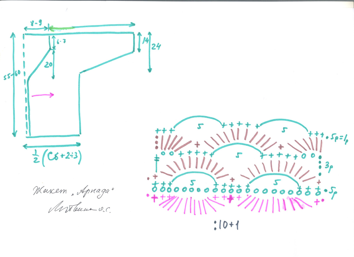 На полотне спинки определите и наметьте размер и форму выреза горловины переда. Определите длину начальной цепочки для полочек. Вяжите часть полочки 3 с прибавками в рядах с дугами, затем деталь 4. Определите длину цепочки на вертикальной части горловины переда и сделайте этот переход в ряду из столбиков с накидом. Далее вяжите полотн
