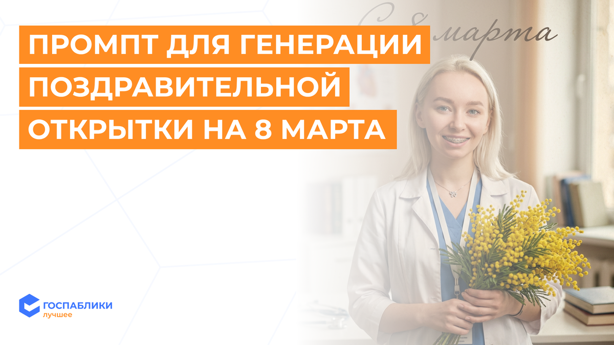 Сам промпт: Использовать загруженное изображение как визуальный референс для внешности женщины. Создать реалистичный портрет женщины с похожими чертами лица, причёской и типом внешности, вдохновлёнными референсным фото. Женщина изображена как представитель профессии [указать профессию]. Она держит в руках букет [указать цветы — например мимоза, тюльпаны, нарциссы или весенние цветы]. Сцена происходит в окружении, связанном с этой профессией: [описать интерьер — мастерская художника, кабинет врача, библиотека, школьный класс, лаборатория и т.д.]. На фоне могут находиться предметы, характерные для этой профессии. Композиция — портрет по пояс. Женщина смотрит в камеру с мягкой доброжелательной улыбкой, аккуратно держит букет перед собой. В верхней части изображения размещена надпись «С 8 марта» элегантным рукописным шрифтом, как на праздничной открытке. Стиль изображения — атмосферная художественная фотография в духе винтажной открытки: тёплая цветовая гамма, мягкий рассеянный свет, лёгка