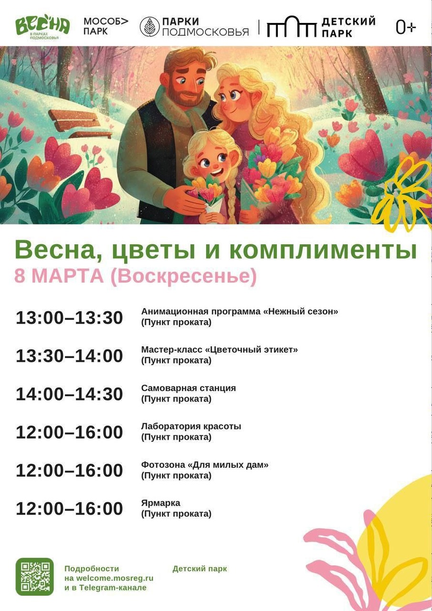 ✨ ВЕСНА, ЦВЕТЫ И КОМПЛИМЕНТЫ! В Детском парке 🎉13.00 - 13.30 Анимационная программа "Нежный сезон" 🌷13.30 - 14.00 Мастер-класс 🍬14.00 - 14.30 Самоварная станция 💅🏻12.00 - 16.00 Лаборатория красоты 📸12.00 - 16.00 Фотозона 🎁12.00 - 16.00 Ярмарка 🚫 Возраст: 0+ 📆 08.03.2026 🕒 13:00 🏢 Детский парк культуры и отдыха 📍 г. Подольск, мкр. Климовск, ул. Заводская, 6а 💰 Вход свободный❗️ ⭐Поддержать канал голосом 🍰Где поесть в Подольске ✅ Мероприятия Подольск https://dzen.ru/id/66ed500f7b5671493eca3fd6 https://vk.ru/podolsk_events http://dzen.ru/podolsk_events