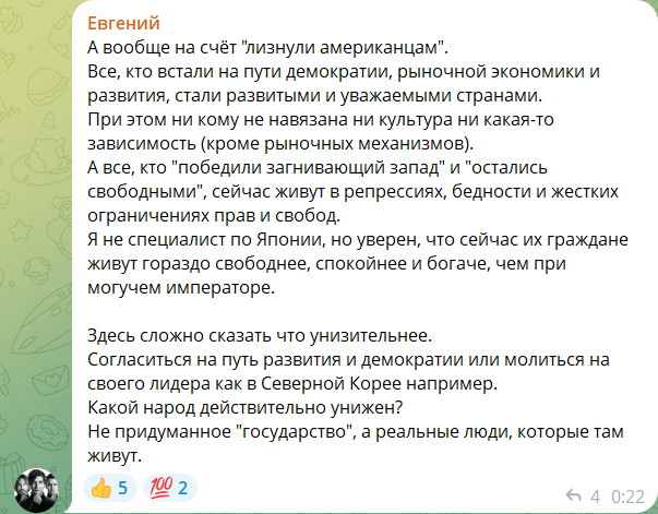 К сожалению, подобные мнения весьма распространены - хотя я вот в упор не понимаю, как люди, пережившие российские девяностые повторяют эту дичь. Ну, возможно, конечно, что этот Евгений младше меня и девяностые просто не застал - к сожалению, в аккаунте нет никакой информации о возрасте, даже нет фотографии - но ведь легко найти и немало высказываний на эту тему от людей, воспитанных в "репрессиях, бедности и жёстких ограничениях прав и свобод" Советского Союза, потом хлебнувших сполна "пути демократии, рыночной экономики и развития" России девяностых, при этом разделяющих взгляды Евгения сполна.