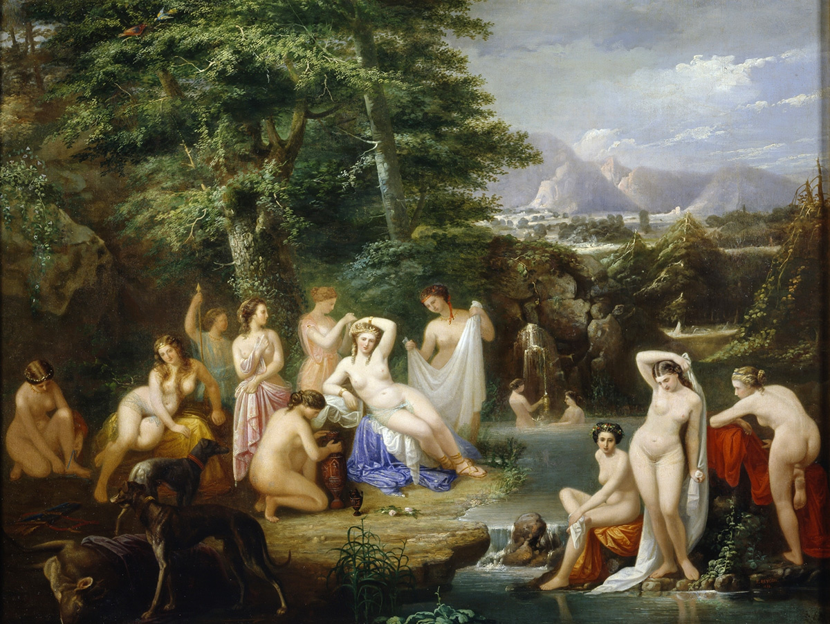 Мотив Диана в купальне позволяет художнику изобразить множество обнажённых фигур в разных позах на фоне вымышленного пейзажа. На данной картине испанского художника Франсиско Рейгон (ок. 1820-1878) фигура Дианы изображена, сидящей на расшитой звездами синей тунике, отсылающей к плащу Ночи. На ней жемчужная корона с луной, символизирующей Селену, одну из ипостасей Дианы как богини этого небесного тела. Олень, животное, посвященное ей, и две собаки, а также колчан со стрелами, указывают на её статус богини охоты. Богиня находится в окружении своих нимф-дев, все они также обнажены и защищены от чужих взглядов густым лесом. Этот мотив также предполагает живописное включение различных ваз, таких, например, как золотая, в которой две нимфы на заднем плане набирают воду. В центре находятся еще два предмета, один из которых небольшой и, вероятно, представляет собой вазу для благовоний, а другой — большая амфора с орнаментом в виде эдикулы. Художник написал эту работу во время своего преб