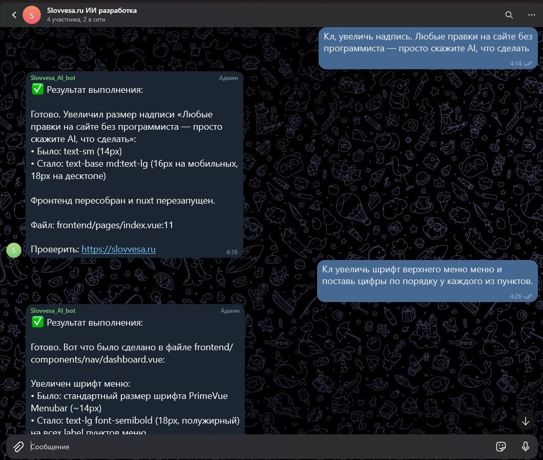 организация не может позволить ему настолько тупую трату времени? Как думаешь, если ИИ уже использует в своих операциях Пентагон, сможет он разобраться в твоем сайте на «Вордепрессе»?)) Просто прикрути нейросеть к сайту, и пусть он ковыряется с кодом. У тебя найдутся задачи поважнее. Продажи, маркетинг, налоги и так далее. У себя в канале я показываю, как искусственный интеллект выполняет SEO-шные работы, улучшает дизайн и пилит новый функционал на реальных проектах. С пруфами, скринами и ценами. Пример на скрине. Узнаешь, как сделать так, чтобы ИИ не поломал твой сайт, и как управлять им через бота в ТГ. Подпишись, чтобы быть в числе первых, кто будет использовать искусственный интеллект для реального заработка, а не для генерации картинок или поздравлений с днем рождения. #реклама О рекламодателе
