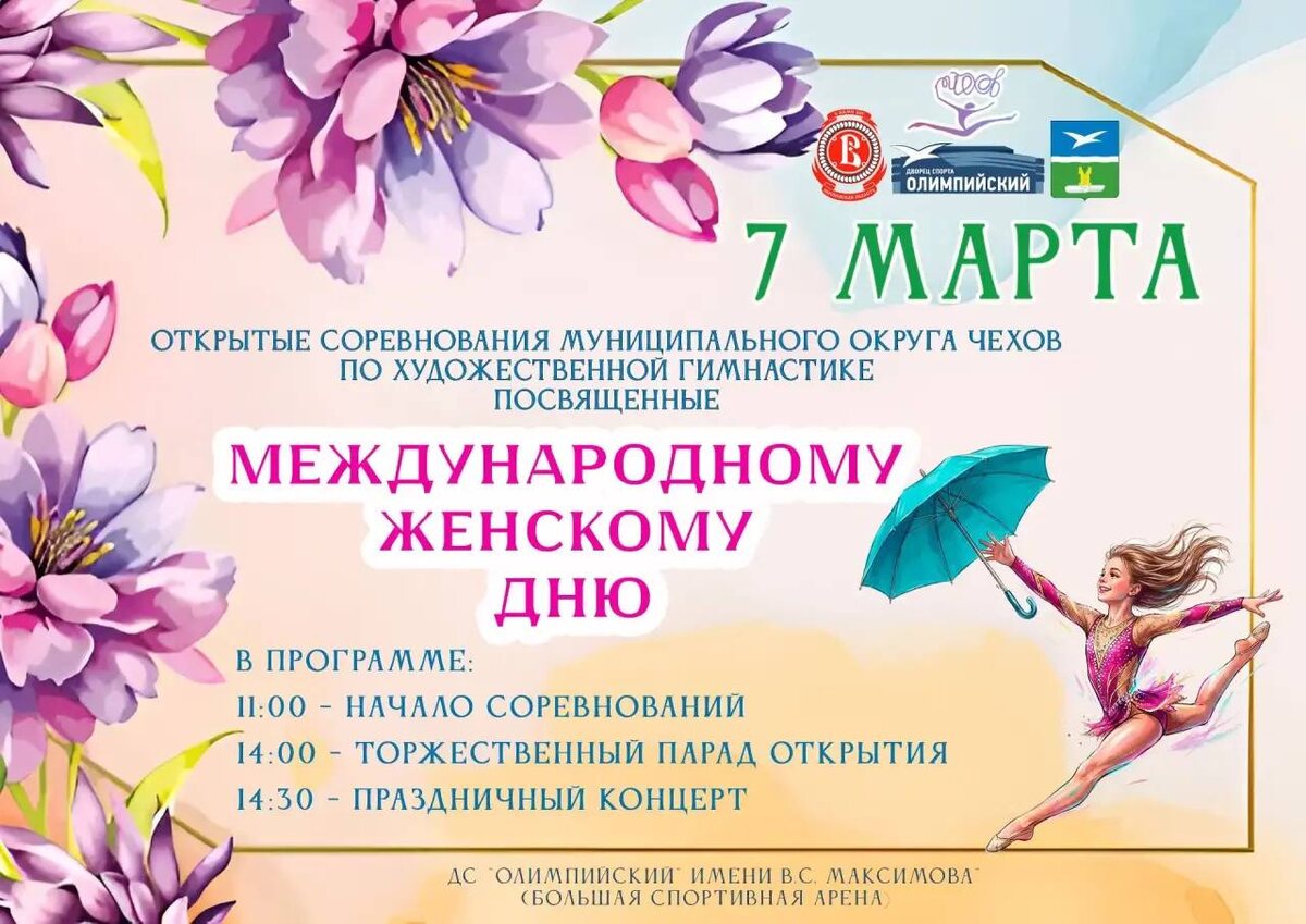 ✨ Открытые соревнования муниципального округа Чехов по художественной гимнастике 👏В программе мероприятия: 11:00 - Начало соревнований 14:00 - Торжественный парад открытия 14:30 - Праздничный концерт ✅ Приглашаем всех насладиться красотой художественной гимнастики! 📆 07.03.2026 🕛 11:00 🏢 ДС «Олимпийский» им. В. С. Максимова 📍 г. Чехов, ул. Полиграфистов, стр.30 🪙 Вход свободный❗️ ⭐Поддержать канал голосом ✅ Мероприятия Чехов https://dzen.ru/id/66cc4b48e9ef144699238a51 https://vk.ru/chekhov_events http://dzen.ru/chekhov_events