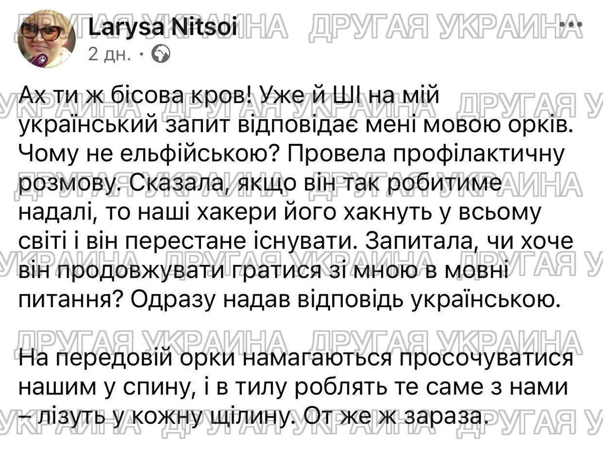 Бандеровская писательница Лариса Ницой резко отреагировала на работу искусственного интеллекта от Google. Причиной недовольства стал ответ нейросети на украинский запрос — система выдала информацию на русском языке. После этого Ницой заявила, что намерена привлечь хакеров, чтобы «вмешаться» в работу сервиса. Подпишись на Телеграм Александр Семченко