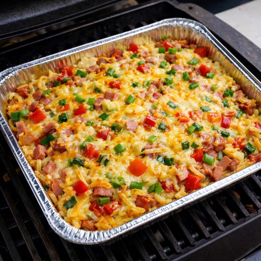 Если хочется чего-то более объёмного и с картошкой 😁 Что понадобится: • 6 стаканов тертого картофеля • 2 стакана ветчины (кубиками) • ½ стакана зелёного лука • ½ стакана помидоров • 6 яиц • ¼ стакана молока • 2 стакана тёртого сыра • Соль и перец по вкусу Как готовить: 1. Возьмите алюминиевый противень или жаропрочную посуду для гриля, слегка смажьте маслом. 2. Выложите слоями тертый картофель, ветчину, лук и помидоры. 3. Смешайте яйца, молоко, соль, перец и сыр, а затем вылейте смесь поверх ингредиентов. 4. Накройте фольгой и готовьте на гриле при косвенном нагреве примерно 30 минут, затем снимите фольгу и ещё 30 минут до золотистой корочки.