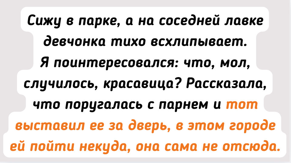 - Сижу в парке, а на соседней лавке девчонка тихо всхлипывает. Я поинтересовался: что, мол, случилось, красавица? Рассказала, что поругалась с парнем и тот выставил ее за дверь, в этом городе ей пойти некуда, она сама не отсюда. Мама старенькая, помочь не может. Я максимально тактично предложил ей перекантоваться у меня (а у меня квартира двухкомнатная), и, к моему удивлению, она согласилась. А утром я проснулся от запахов. Она готовила завтрак. Знатно прифигев, поблагодарил ее за заботу и стал думать, что делать дальше. А она, будто уловив мои мысли, попросила пожить еще 2 дня, дала сфотать свой паспорт. Ну, красть в квартире у меня нечего, я и оставил девушку дома, а сам на работу ушел. Вечером мою холостяцкую обитель было не узнать, везде порядок и чистота. Девушка приготовила ужин и поделилась новостями, что родня сумела ей помочь и через день она улетает домой. Через неделю я позвонил ей и предложил снова приехать ко мне. Билеты, естественно, с меня. А она взяла и согласилась. Вот так и живем уже 8 лет. © LeoneTomsk
