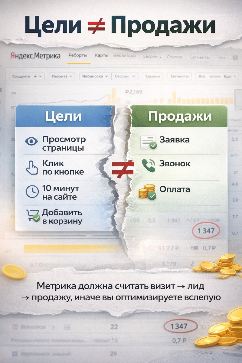 Это типовая история: реклама идёт, SEO даёт посещаемость, соцсети приносят переходы. В Метрике есть графики, отчёты, даже “конверсии”. Но на вопрос собственника — “что приносит деньги?” — ответить нечем.
