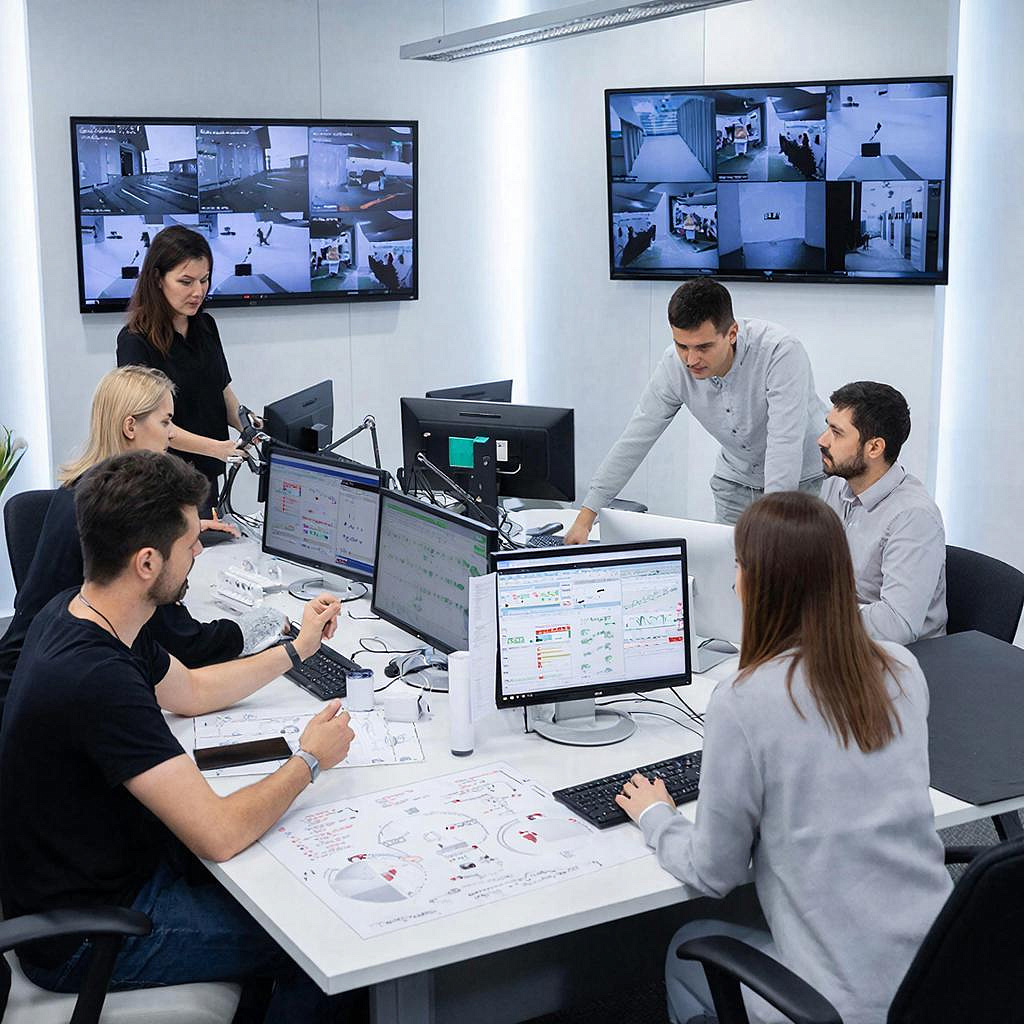 - Предпроектное обследование: замеры, фото, тесты сети. - Согласование списка камер и мест. - Поставка оборудования и согласование замен (модели/аналоги). - Монтаж кабелей, кронштейнов, камер. - Установка PoE-коммутаторов и сервера. - Настройка Trassir: добавление камер, назначение ролей, резерв. - Тестирование: пропускной тест, просмотр по удалённому доступу, проверка аналитики. - Обучение персонала и передача документации (экспорт конфигурации, лицензии).
