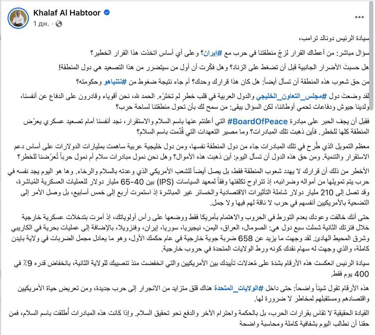 Π³ΠΎΡΡΠ΄Π°ΡΡΡΠ² ΠΠ΅ΡΡΠΈΠ΄ΡΠΊΠΎΠ³ΠΎ Π·Π°Π»ΠΈΠ²Π° ΠΈ Π΄ΡΡΠ³ΠΈΠ΅ Π°ΡΠ°Π±ΡΠΊΠΈΠ΅ Π³ΠΎΡΡΠ΄Π°ΡΡΡΠ²Π° Π² ΡΠ΅Π½ΡΡ ΠΎΠΏΠ°ΡΠ½ΠΎΡΡΠΈ, ΠΊΠΎΡΠΎΡΡΡ ΠΎΠ½ΠΈ Π½Π΅ Π²ΡΠ±ΠΈΡΠ°Π»ΠΈ. ΠΡΠΎ ΠΏΠΎΠ·Π²ΠΎΠ»ΠΈΠ» Π²Π°ΠΌ ΠΏΡΠ΅Π²ΡΠ°ΡΠ°ΡΡ Π½Π°Ρ ΡΠ΅Π³ΠΈΠΎΠ½ Π² ΠΏΠΎΠ»Π΅ Π²ΠΎΠΉΠ½Ρ?Β» - ΠΏΠΈΡΠ΅Ρ ΠΠ»Ρ Π₯Π°Π±ΡΡΡ. ΠΠ»Ρ Π₯Π°Π±ΡΡΡ ΠΎΡΠΌΠ΅ΡΠΈΠ», ΡΡΠΎ ΡΡΡΠ°Π½Ρ ΠΠ»ΠΈΠΆΠ½Π΅Π³ΠΎ ΠΠΎΡΡΠΎΠΊΠ° Π²Π½Π΅ΡΠ»ΠΈ ΠΌΠΈΠ»Π»ΠΈΠ°ΡΠ΄Ρ Π΄ΠΎΠ»Π»Π°ΡΠΎΠ² Β«Π‘ΠΎΠ²Π΅ΡΡ ΠΌΠΈΡΠ°
